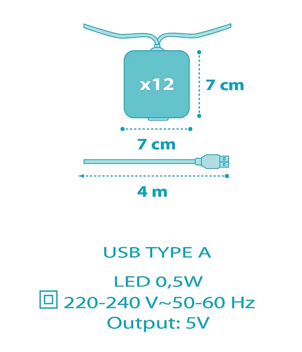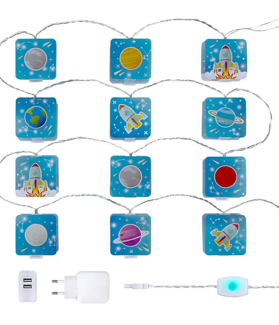 Guirlande veilleuse avec imprimé de Fusée dans l’espace, 4 mètres de longueur. Elle dispose d’un interrupteur avec lumière, trois intensités de lumière LED et un adaptateur secteur avec deux prises USB de 2,5W (12V).
