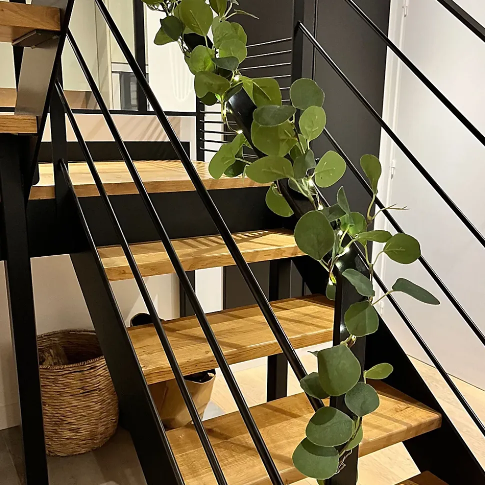 Apportez une touche lumineuse à votre décoration intérieure ou extérieure avec notre guirlande branches d’eucalyptus. 1.8m de branches lumineuse à piles à placer sur une table, une rampe d’escalier, elle illumera votre chez vous.• Couleur de LED : Blanc Chaud• Nb de LED : 50 microLED• Couleur du câble : Câble argent• Animation : Fixe• Dimensions : L1,8m• Luminosité : 75 lumens• Alimentation : A piles, 3 piles AA 1,5V Alkaline, non incluse(s)• Matière : PVC Souple• Usage : Intérieur/Extérieur• Indice de protection : IP44• Garantie : 2 ansUsage & installation :Cette jolie guirlande à branches d’eucalyptus sur piles est idéale pour décorer votre intérieur ou extérieur. Elle trouvera sa place sur une rampe d’escalier ou une table. Elle apportera une belle touche lumineuse naturelle à votre décoration.Données techniques & dimensions :Cette guirlande branches d’eucalyptus fonctionne avec 3 piles AA non incluses. Vous pouvez utiliser la fonction Timer pour éviter d’éteindre votre guirlande manuellement. Elle s’éteindre toute seule. Fonction Timer : 6h ON et 18h OFF. Le câble est sécurisé par un revêtement. Source lumineuse :Cette guirlande est composée de 50 microLED blanc chaud fixe, nouvelle génération 3x plus lumineuse qu’une LED normale. Sa luminosité est de 75 lumens