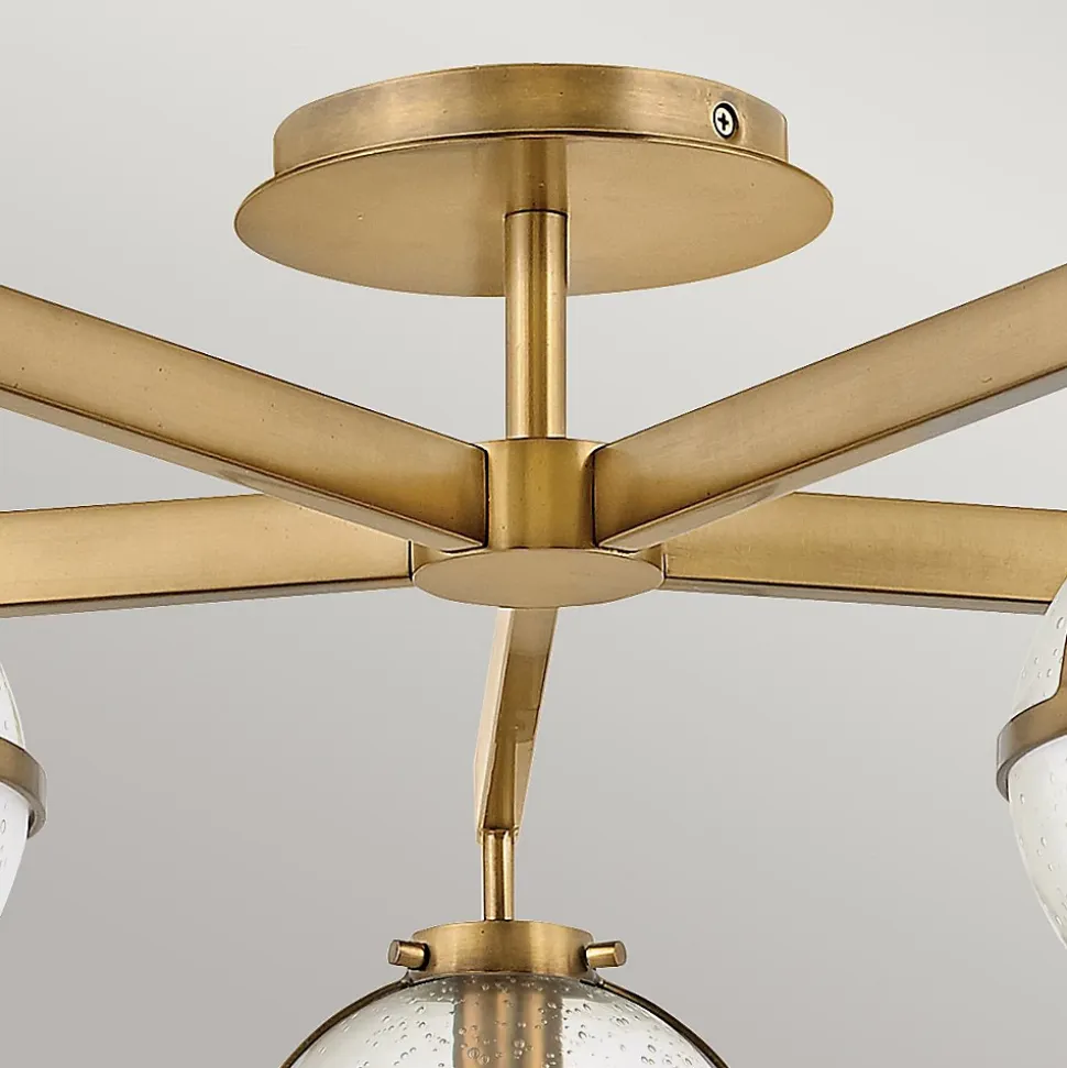 Le design rétro avec des globes de Hollis évoque une ambiance des années 1950, mais ses lignes épurées et sa silhouette sophistiquée offrent une polyvalence pour une variété de décors. Le grand plafonnier semi-encastré à 5 lumières offre un éclairage supérieur pour les pièces avec des plafonds plus bas. Les globes en verre clair à motifs brillent avec une finition laiton patiné. Cet équipement est classé IP44 pour une utilisation dans la salle de bains, mais convient également à n’importe quelle autre pièce intérieure.