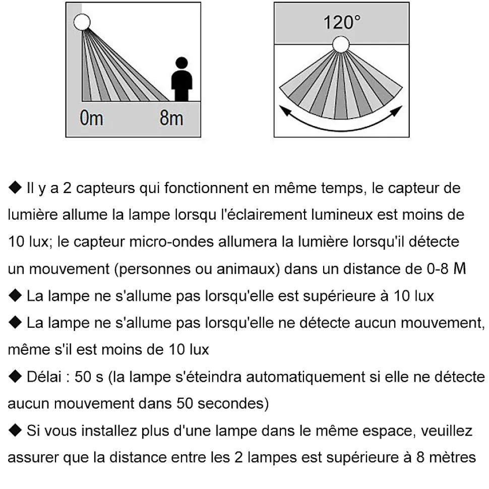 Tension nominale : AC 220-240V Angle de diffusion : 120° Température de lumière : 4000K Durée de vie : 25 000h IRC : >80Ra Facteur de puissance : >0.90 Temps d’allumage : Instantané Indice d’étanchéité : IP54 Température d’opération : -20°C à 45°C Environnement de travail : Extérieur-Intérieur Matériaux : PCGarantie : 2 ans