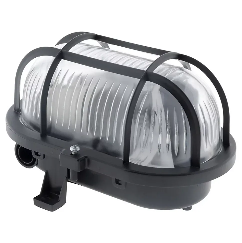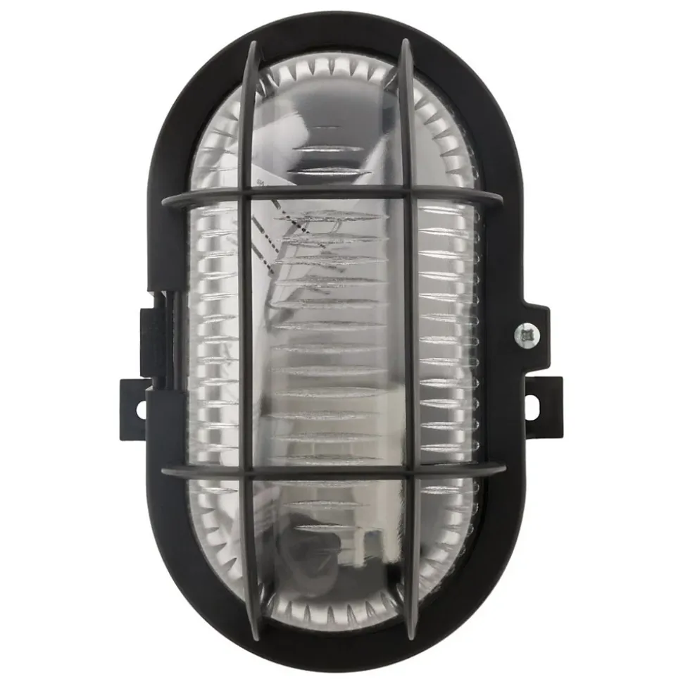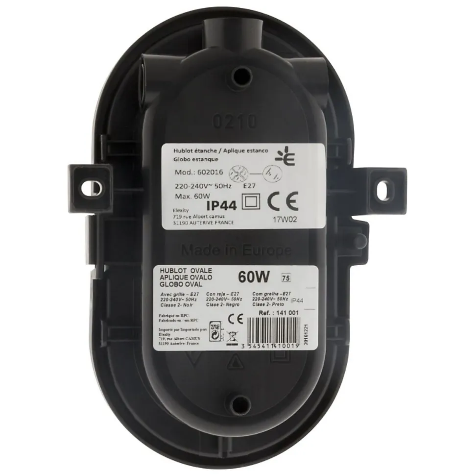 Hublot ovale en finition noire monté sur socle en plastique haute résistance et vasque en verre haute résistance à la chaleur (650°). Livré avec grille de protection. Caractéristiques : Tension 220V – 240V – 50Hz – Classe II Puissance max 60W De qualité professionnelle, ce type de hublot s’installe facilement pour éclairer un local extérieur, une cuisine d’été, votre garage, votre entrée ou votre jardin durant toute l’année Existe en couleurs : Noir (3545411410019), Blanc (3545411410002),