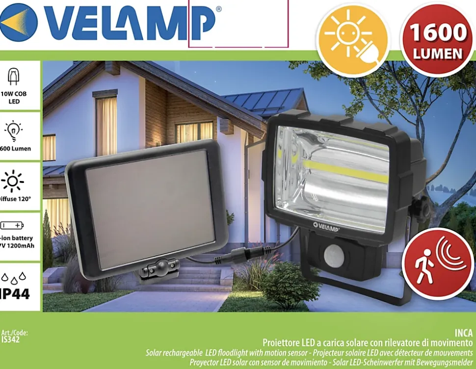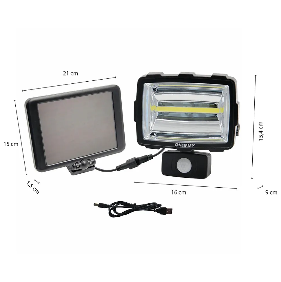Extrêmement lumineux: grâce à l’utilisation de la dernière génération de LED COB, le projecteur atteint 1600 lumens. C’est un éclairage de sécurité parfait pour éclairer un passage, une entrée … Grâce au détecteur de mouvement, il s’allumera et s’éteindra automatiquement en cas de mouvement. Économie d’énergie: la lampe solaire avec détecteur de mouvement est rechargée par le panneau solaire. Il ne consomme aucun courant électrique. Le panneau solaire et le projecteur sont connectés par un câble de 3,7 m de long. Installation facile: il suffit de fixer le projecteur au mur (support réglable) et de le connecter au panneau solaire à l’aide du connecteur étanche. L’installation est terminée! Étanche et résistant: avec certification IP44 (résistant à l’eau). Structure en polycarbonate extrêmement robuste. Le panneau solaire 1W est en plastique hyper-résistant. La batterie incluse est également remplaçable (Li -ion 1.2Ah 18650): vous pouvez donc augmenter l’autonomie avec une batterie avec encore plus de capacité. Le projecteur est fourni avec un câble USB: vous pouvez donc choisir de ne pas le connecter au panneau solaire mais à un chargeur normal 5V 1A (du type que vous utilisez pour votre smartphone). Il sera toujours opérationnel, même à l’intérieur ou dans des zones non ensoleillées.