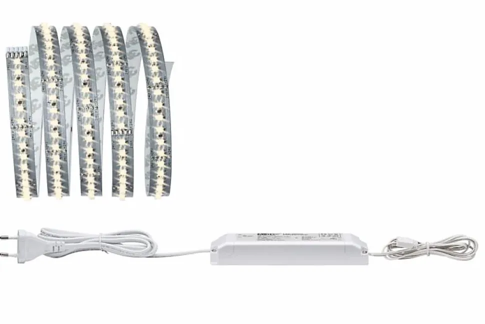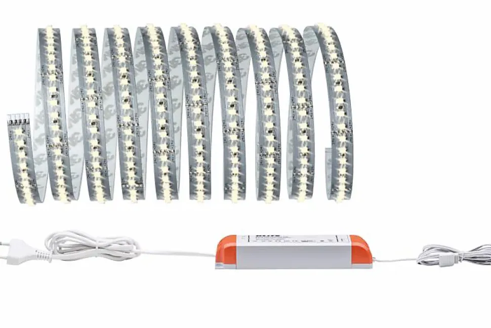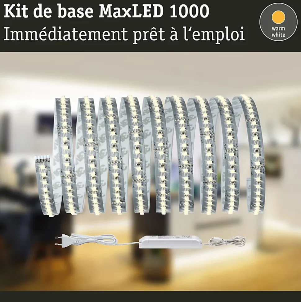 Ruban LED MaxLED prêt à l’emploi avec alimentation 24 V, 90 LED et flux total de 3300 lm. Flexible, autocollant et sectionnable, il se pose et se raccorde facilement, est dimmable et peut être étendu jusqu’à 5,3 m pour s’adapter à tous vos projets d’éclairage intérieur.