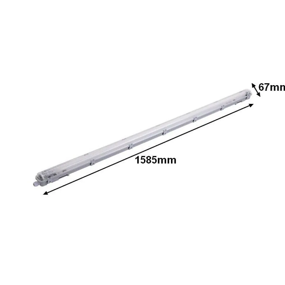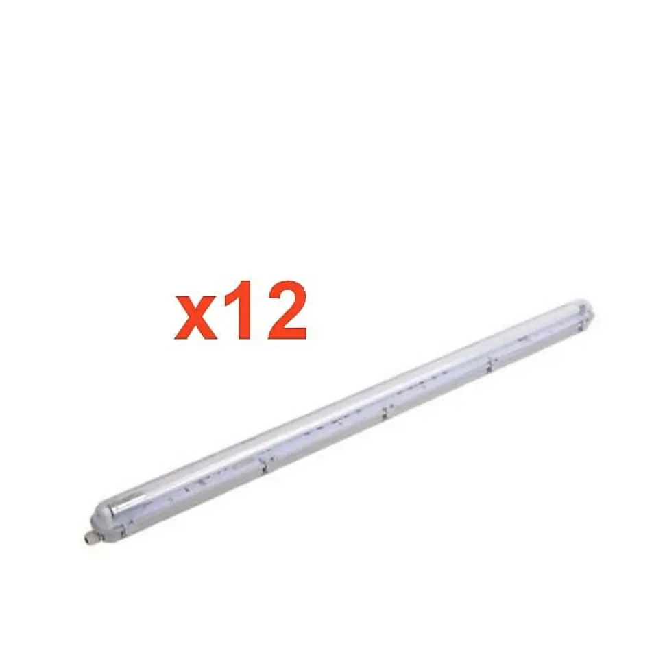 Ce pack de 12 réglettes LED étanches avec tube T8 150 cm 22W est conçu pour offrir une solution d’éclairage LED complète, puissante et durable dans les environnements professionnels, techniques ou résidentiels. Prêt à l’emploi, ce lot permet d’équiper efficacement de grandes surfaces tout en garantissant performance et sécurité.Spécificités techniques du pack 12 réglettes LED étanches avec tubes 150 cmPuissance par unité : 22W, soit 264W pour le pack complet.Flux lumineux : 2000 lumens par réglette, 24 000 lumens au total.Type de tube : LED T8 150 cm, alimentation unilatérale uniquement.Angle d’éclairage : 180°, couverture maximale de l’espace éclairé.Indice de protection : IP65, protégé contre la poussière et les projections d’eau.Dimensions par réglette : 158,5 x 6,7 x 6,3 cm.Matériaux : Verre + PVC, résistance et durabilité renforcées.Température de fonctionnement : -20°C à +40°C.Durée de vie estimée : ~25 000 heures.Rendu des couleurs (IRC) : Ra 80.Tension : 220-240V AC, fréquence 50/60Hz.Classe énergétique : F.Couleur : Blanc.Certification : CE & RoHS.Non dimmable, non orientable, incompatible variateur.Garantie : 2 ans.Atouts du kit LED étanche 150 cm en lot de 12Ce lot de 12 réglettes LED 150cm IP65 permet un équipement complet à grande échelle tout en réduisant les coûts d’achat par unité