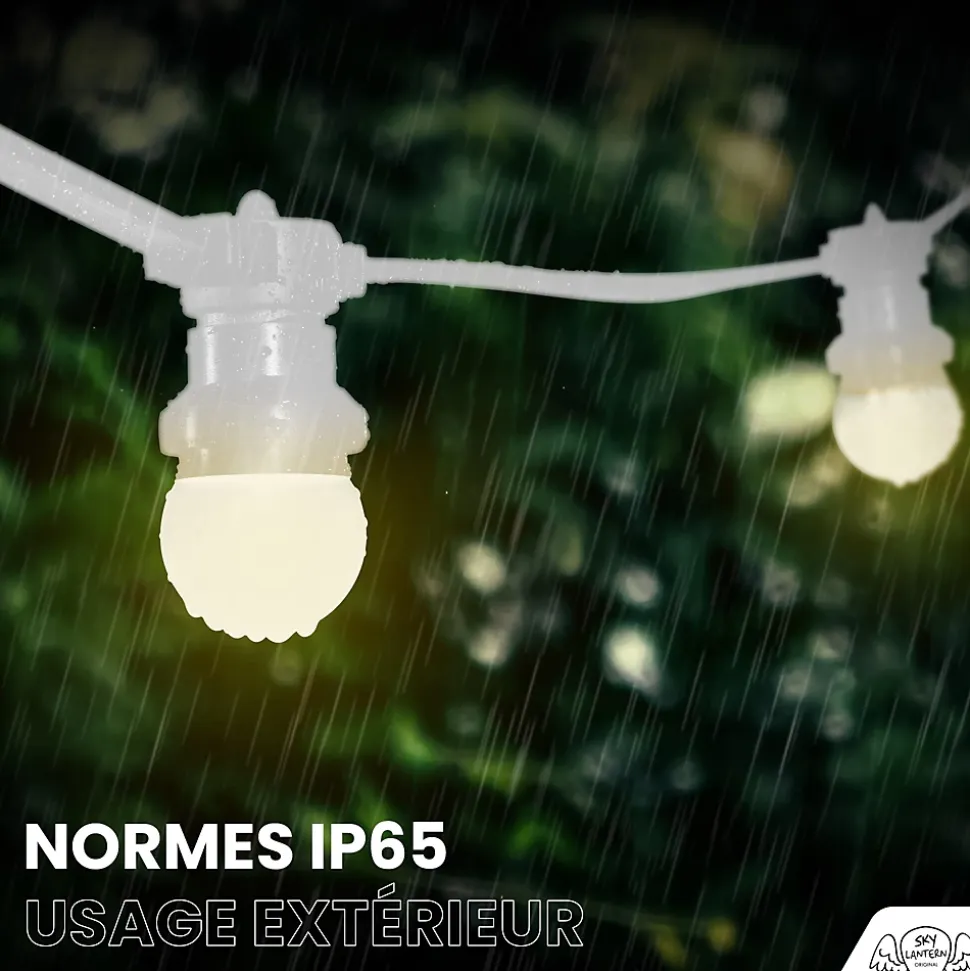 - ETANCHE IP65 ET SECURITE : Les ampoules de notre guirlande guinguette sont étanches aux normes CE et IP65, ne craignent pas la poussière et sont remplaçables! Résiste aux intempéries et peut être laisser dehors toute l’année !
