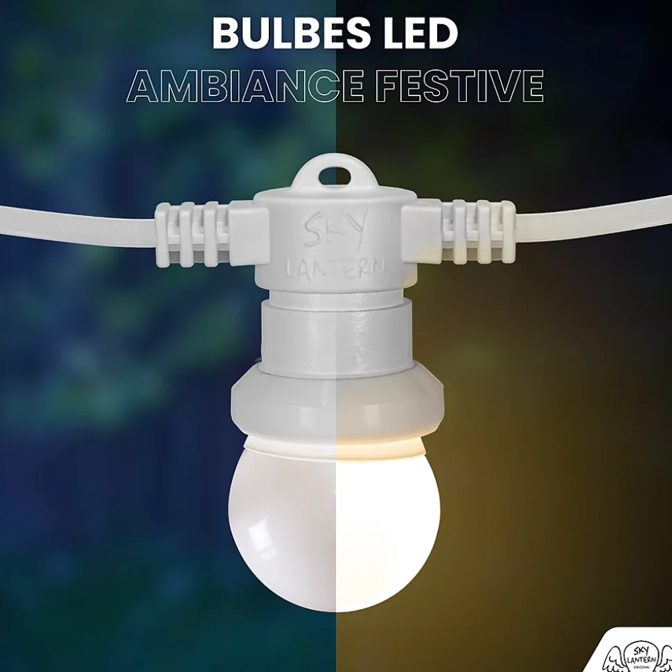 La plus longue guirlande guinguette extérieur du marché !!! SkyLantern, leader en France de la guirlande guinguette extérieur de grande taille vous propose une guirlande guinguette de 100 mètres de longueur sans transformateur (prise 220V) pour illuminer vos grands espaces extérieurs: terrasses de châteaux, place du village, parc. Cette guirlande guinguette géante de grande longueur est totalement adaptée à un usage extérieur à l’année grâce à sa spécification IP65 (résistance maximum à l’eau et à la poussière). Ce kit comprend 10 guirlandes guinguettes de 10 mètres chacune raccordables entre elles et 100 bulbes LEDs blanches dotés de 8 LEDs chacun. L’utilisation d’un module de 8 leds par bulbe permet un éclairage intense sur chaque ampoule. Ce bulbes sont remplaçables (culot E27). Toutes nos Guirlandes Guinguette extérieur sont garanties 2 ans. Lumen : 100 Température de couleur : 2800 Kelvins Puissance : 1,2 W