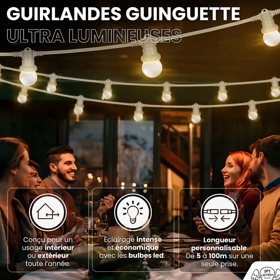 La plus longue guirlande lumineuses guinguette extérieur blanche totalement outdoor SkyLantern, leader en France de la guirlande LED guinguette de grande taille vous propose une guirlande guinguette de 20 mètres de longueur sans transformateur (prise 220V) pour illuminer vos grands espaces extérieurs: terrasses de châteaux, place du village, parc. Cette guirlande de grande longueur est totalement adaptée à un usage extérieur à l’année grâce à sa spécification IP65 (résistance maximum à l’eau et à la poussière). Ce kit comprend 2 guirlandes guinguettes de 10 mètres chacune raccordables entre elles et 20 bulbes LEDs blancs dotés de 8 LEDs chacune. L’utilisation d’un module de 8 leds par bulbe permet un éclairage intense sur chaque bulbe. Ce bulbes sont remplaçables (culot E27). Toutes nos Guirlandes Guinguette sont garanties 2 ans. Lumen : 100 Température de couleur : 2800 Kelvins Puissance : 1,2 W