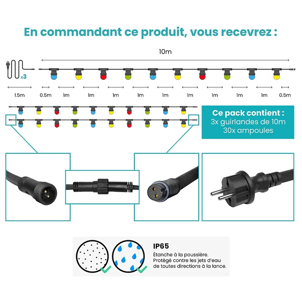 La plus longue guirlande lumineuses guinguette extérieur multicolore totalement outdoorSkyLantern, leader en France de la guirlande LED guinguette de grande taille vous propose une guirlande guinguette de 30 mètres de longueur sans transformateur (prise 220V) pour illuminer vos grands espaces extérieurs: terrasses de châteaux, place du village, parc. Cette guirlande de grande longueur est totalement adaptée à un usage extérieur à l’année grâce à sa spécification IP65 (résistance maximum à l’eau et à la poussière). Ce kit comprend 3 guirlandes guinguettes de 10 mètres chacune raccordables entre elles et 30 bulbes LEDs multicolores dotés de 8 LEDs chacune. L’utilisation d’un module de 8 leds par bulbe permet un éclairage intense sur chaque bulbe. Ce kit guirlande guinguette contient 8 bulbes bleus, 8 jaunes, 7 rouges, 7 verts. Ces bulbes sont remplaçables (culot E27). Toutes nos Guirlandes Guinguette sont garanties 2 ans.