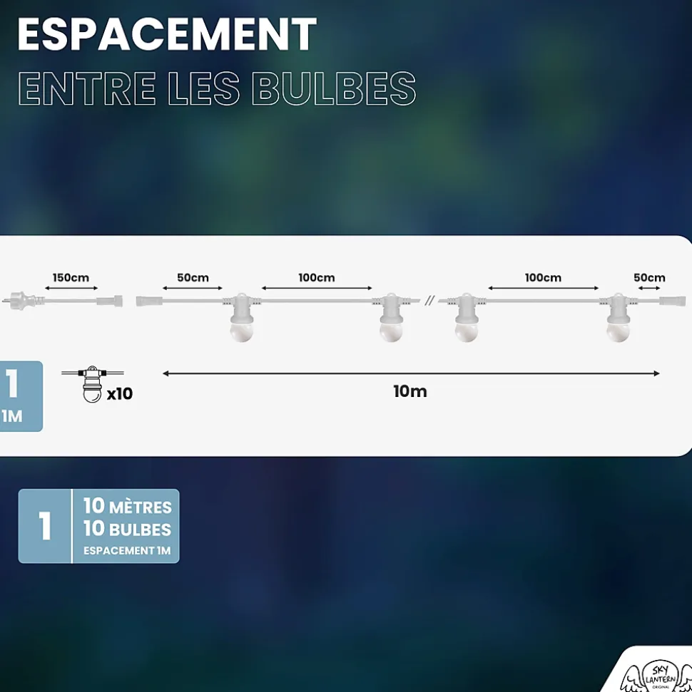 La plus longue guirlande lumineuses guinguette extérieur blanche totalement outdoor SkyLantern, leader en France de la guirlande LED guinguette de grande taille vous propose une guirlande guinguette de 30 mètres de longueur sans transformateur (prise 220V) pour illuminer vos grands espaces extérieurs: terrasses de châteaux, place du village, parc. Cette guirlande de grande longueur est totalement adaptée à un usage extérieur à l’année grâce à sa spécification IP65 (résistance maximum à l’eau et à la poussière). Ce kit comprend 3 guirlandes guinguettes de 10 mètres chacune raccordables entre elles et 30 bulbes LEDs blancs dotés de 8 LEDs chacune. L’utilisation d’un module de 8 leds par bulbe permet un éclairage intense sur chaque bulbe. Ce bulbes sont remplaçables (culot E27). Toutes nos Guirlandes Guinguette sont garanties 2 ans. Lumen : 100 Température de couleur : 2800 Kelvins Puissance : 1,2 W