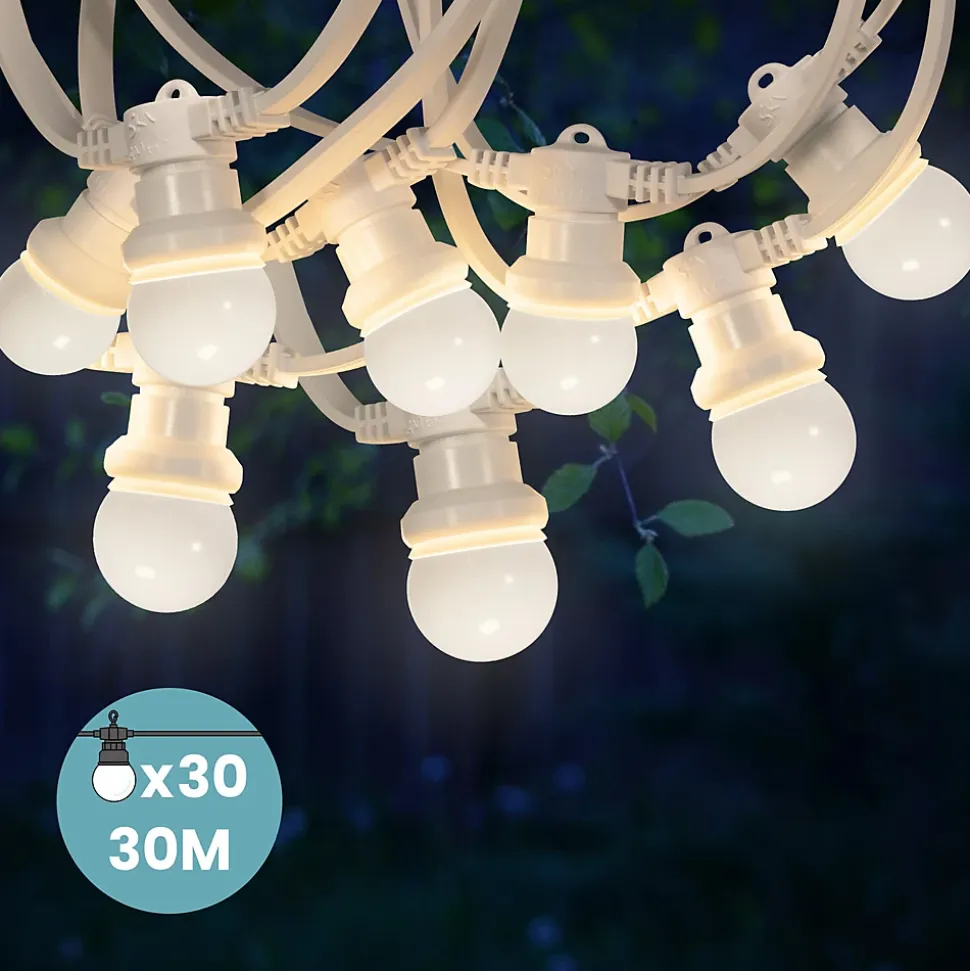 - UNE ATMOSPHERE UNIQUE : Grâce à notre guirlande guinguette de 30M composée de 30 bulbes blancs étanches avec 2800 Kelvins et 100 Lumens, créez des atmosphères féerique lors de votre mariage, votre anniversaire, ou pour d’autres fêtes et célébrations !