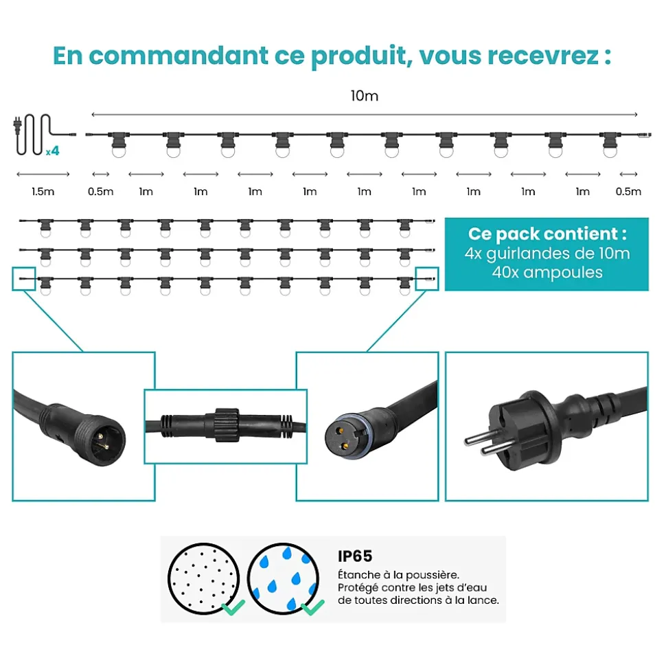 - ÉTANCHE IP65 ET SÉCURITÉ : Les ampoules de notre guirlande guinguette sont étanches aux normes CE et IP65, ne craignent pas la poussière et sont remplaçables !