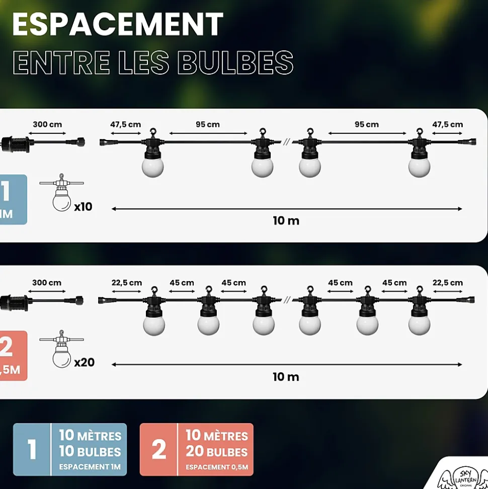 - LONGUEUR EXTRÊME : La guirlande guinguette d’une longueur de 50M est idéale pour les grands espaces tels que les parcs, chateaux ou mariages en exterieur. Idéal pour créer un sublime ciel guinguette avec les 50 bulbes blancs !