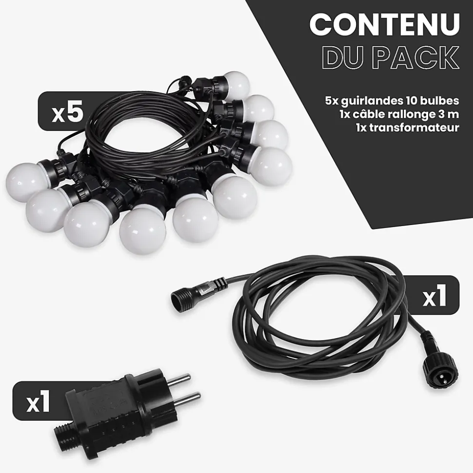 La plus grande de nos guirlande guinguette blanche !Plus de 50 mètres de Guirlande Guinguette sur un seul transformateur 24v; c’est ce que nous proposons dans ce kit comprenant un transformateur et 5 guirlandes guinguettes extérieur blanches de 10 mètres chacune; composées de 50 bulbes Leds couleur blanc chaud ainsi qu’une rallonge de 3M. Nos guirlandes guinguettes extérieures sont classées IP44; elles peuvent donc être utilisées en extérieur (pergola; chapiteau; tonnelle; terrasse couverte) à l’année.Avec cette guirlande guinguette; vous serez en mesure de décorer de très grands espaces extérieurs tels que des parcs; des places de village ou de grands jardins. Notre kit guirlande guinguette extérieur de 50M saura recréer toute l’atmosphère des guinguettes d’antan.