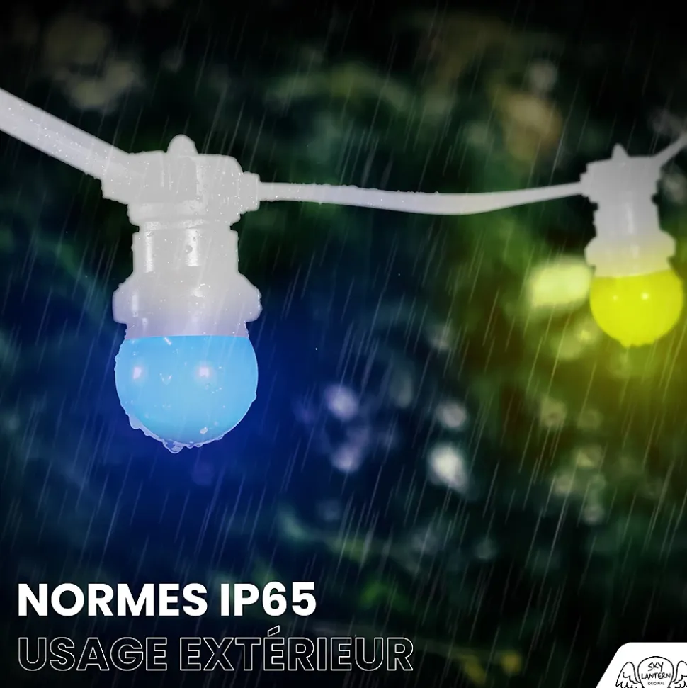 La plus longue guirlande lumineuses guinguette extérieur multicolore totalement outdoorSkyLantern; leader en France de la guirlande LED guinguette de grande taille vous propose une guirlande guinguette de 50 mètres de longueur sans transformateur (prise 220V) pour illuminer vos grands espaces extérieurs: terrasses de châteaux; place du village; parc. Cette guirlande de grande longueur est totalement adaptée à un usage extérieur à l’année grâce à sa spécification IP65 (résistance maximum à l’eau et à la poussière). Ce kit comprend 5 guirlandes guinguettes de 10 mètres chacune raccordables entre elles et 50 bulbes LEDs multicolores dotés de 8 LEDs chacune. L’utilisation d’un module de 8 leds par bulbe permet un éclairage intense sur chaque bulbe. Ce bulbes sont remplaçables (culot E27). Toutes nos Guirlandes Guinguette sont garanties 2 ans.