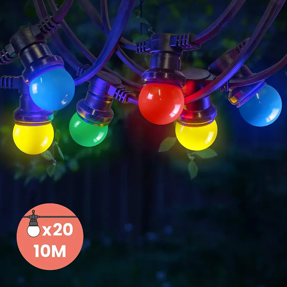 Des bulbes éclatants; une lumière intense !La guirlande guinguette; l’incontournable tendance revient une fois de plus sur le devant de la scène pour vous proposer un nouveau modèle.Ce nouveau modèle disponible en différentes tailles; 5; 10; 20; 30; 50 et 100M. Elle est disponible dans nos 3 coloris : blanc; transparent et multicolore !Cette guirlande de grande longueur est totalement adaptée à un usage extérieur à l’année grâce à sa spécification IP65 (résistance maximum à l’eau et à la poussière)La spécificité de notre nouvelle guirlande est le nombre de bulbes par guirlande ! Nous avons depuis toujours proposé des guirlandes de 10M possédant 10 Bulbes. Aujourd’hui; nous vous proposons le double ! Les guirlandes guinguette de 10M pour 20 bulbes lumineux!Obtenez un extérieur féerique sous la lumière de nos bulbes ! Plus qu’une ambiance guinguette; créez un moment festif entre famille et amis !Ce kit comprend 1 guirlande guinguette de 10 mètres et 20 bulbes LEDs multicolores dotés de 8 LEDs chacune. L’utilisation d’un module de 8 leds par bulbe permet un éclairage intense sur chaque bulbe. Ces bulbes sont remplaçables (culot E27). Toutes nos Guirlandes Guinguettes sont garanties 2 ans.Important : Il est recommandé de bien visser les ampoules à fond dans le culot afin de garantir une étanchéité parfaite aux intempéries.Astuce: Si votre ampoule ne s’allume pas c’est qu’il faut encore visser ! Lumen : 100 Température de couleur : 2700 Kelvins Puissance : 1;2 W