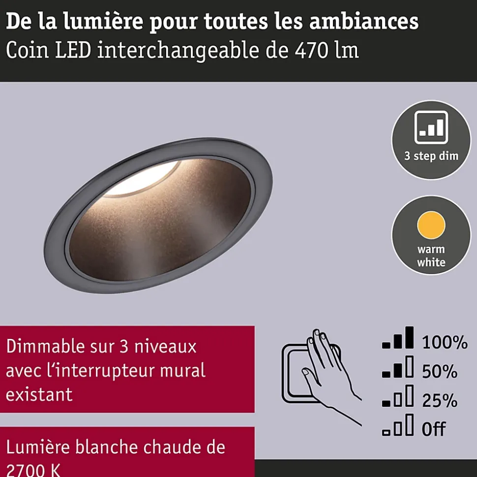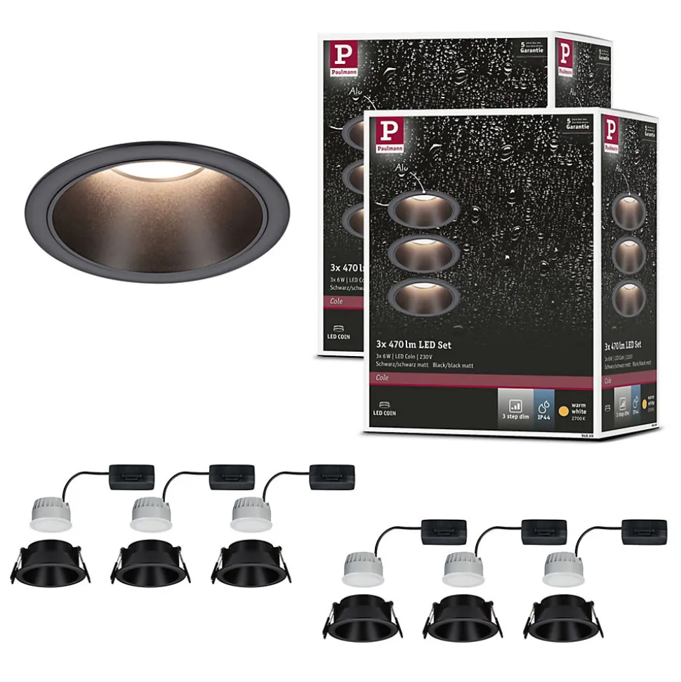 Le coup de foudre au deuxième regard ! Les spots encastrés Cole en noir dépoli se fondent presque dans le plafond grâce aux sources lumineuses placées en retrait. Mais une fois qu’on les a découverts, on ne veut plus les quitter des yeux. Les spots encastrés de haute qualité sont proposés dans un attrayant set de six pièces, disponible à un prix réduit. Ce set avantageux et pratique, composé de six spots encastrés blanc chaud, fait briller toute une pièce. Grâce au coin en retrait, l’éclairage est doux et non éblouissant. Grâce au raccordement direct de 230V, les luminaires peuvent facilement être reliés entre eux sans restriction. Grâce à la protection ip élevée de IP44, les spots encastrés conviennent parfaitement aux pièces humides et sont protégés contre les projections d’eau. De plus, ils marquent des points avec une technique brillante : le coin LED interchangeable fournit une lumière blanche chaude agréable et peut être réglé sur trois niveaux à l’aide d’un interrupteur d’éclairage conventionnel. Selon les besoins, il est ainsi possible d’adapter la luminosité – de la lumière d’ambiance à l’éclairage complet.