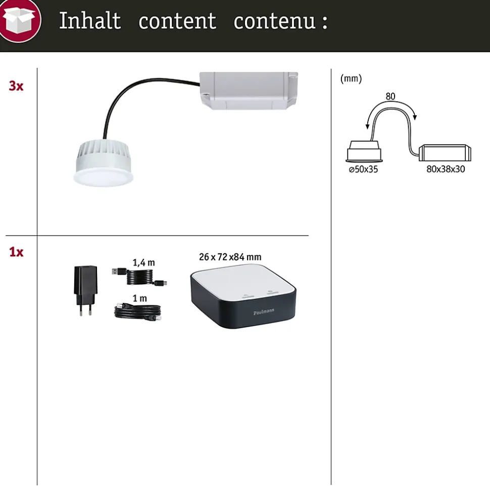 Offre kit avec un avantage de prix attractif|Commande déclairage automatique – les minuteries ou routines en fonction du moment également avec affichage ou masquage permettent une configuration intuitive|Technologie LED performante|Utilisation facile et polyvalente par application, commande vocale ou accessoires|Pour raccordement direct au secteur 230V|Installation gratuite de Paulmann smik App sur votre smartphone Android ou iOS|Confort déclairage grâce à des routines automatiques et une commande à distance fiable|Centrale de commande moderne de votre monde de lumière Paulmann-Zigbee intelligent|Changement de couleur multicolore RGBW|Utilisation rapide par commande vocale avec Alexa d’Amazon et Google Assistant|Très plat : le montage peut s’effectuer même avec une faible profondeur de la cavité de seulement 30 mm.|Accès direct à votre éclairage intelligent sans connexion préalable au compte ou connexion internet existante – uniquement nécessaire pour les fonctions comme la commande vocale ou la mise à jour de logiciels|Contrôlable par la télécommande Smart Home Zigbee|Commande de vos produits déclairage Zigbee 3.0 de Paulmann et de fabricants compatibles dans les espaces intérieurs et extérieurs grâce au réseau mesh|Gradable en continu