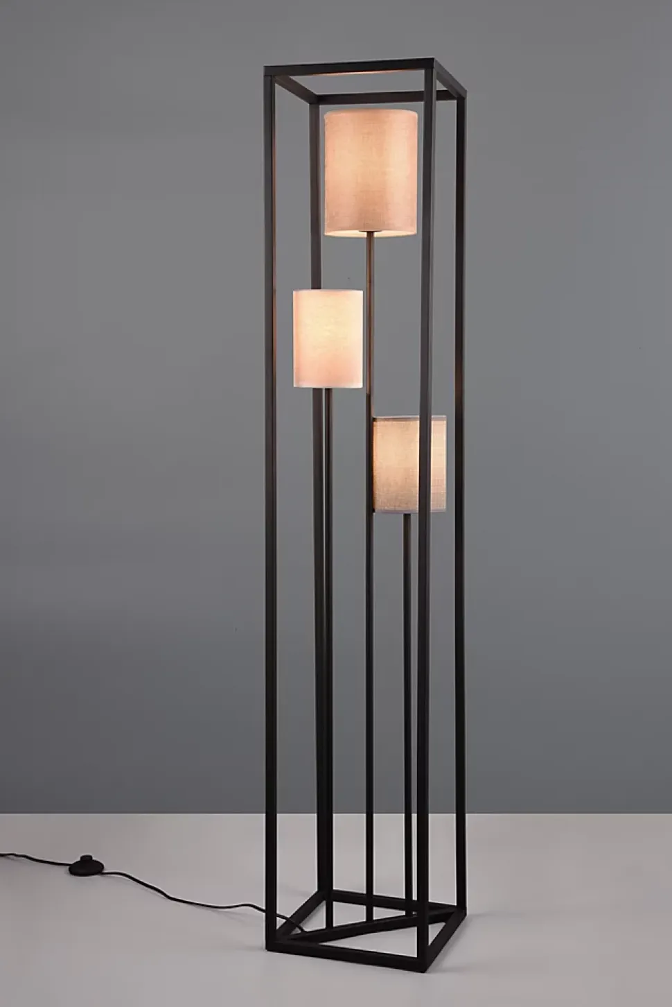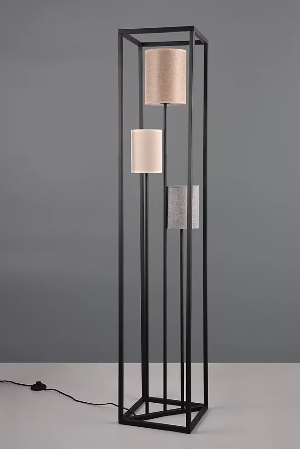Les caractéristiques techniquesLe lampadaire Trio Ross est un modèle élégant à trois abat-jour en tissu beige, gris et brun, idéal pour apporter une lumière douce et chaleureuse à votre intérieur. Avec un cadre en métal noir mat, il offre un design moderne tout en restant discret et raffiné.Ce lampadaire est équipé d’un interrupteur à pied pratique, permettant de l’allumer et de l’éteindre facilement sans se pencher. Il fonctionne avec trois ampoules E27 (non fournies), chacune ayant une puissance maximale de 25W, vous permettant de choisir l’intensité lumineuse qui convient à vos besoins.Les avantages esthétiquesLe lampadaire Trio Ross se distingue par son design simple et élégant. L’association de son métal noir mat et des abat-jours en tissu dans des tons naturels (beige, gris, brun) crée une ambiance chaleureuse et accueillante. Il s’intègre parfaitement dans un intérieur moderne ou minimaliste.Efficacité énergétiqueNous recommandons l’utilisation d’ampoules LED pour ce lampadaire, car elles sont non seulement économes en énergie, mais offrent aussi une lumière de haute qualité. Les ampoules LED peuvent vous faire économiser jusqu’à 80 % d’énergie par rapport aux ampoules halogènes classiques et ont une durée de vie prolongée.
