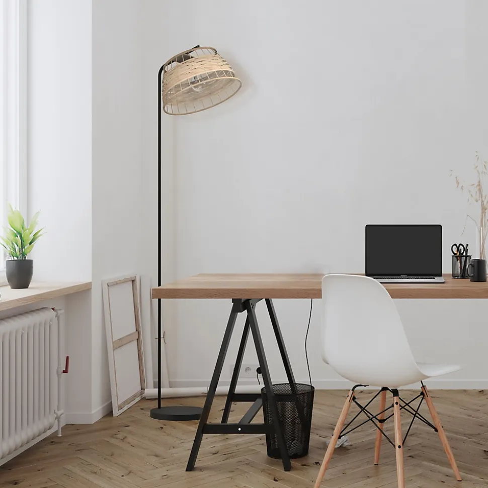 - Le lampadaire UMSTON se compose d’un abat-jour en forme de cloche, en rotin tressé et d’un pied en métal noir