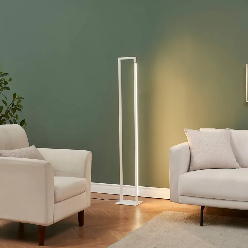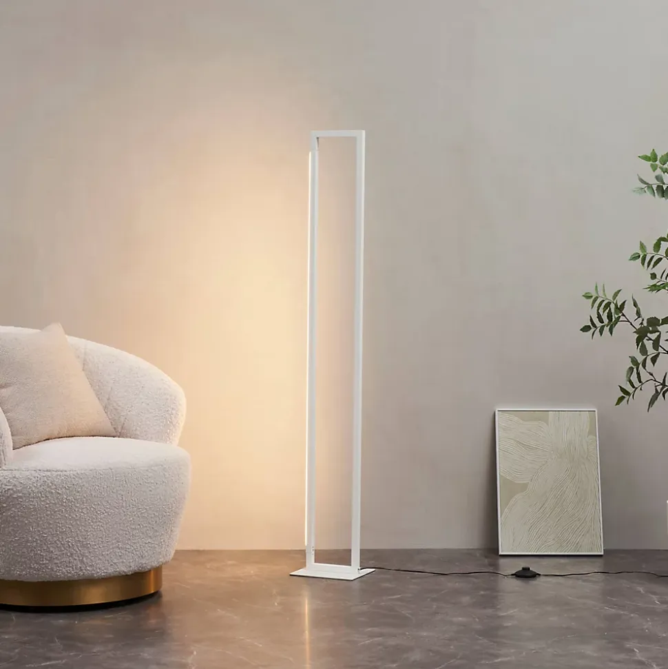 Laka est un lampadaire minimaliste en aluminium blanc, en forme de rectangle allongé, mesurant 140 cm de haut. Doté de LED intégrées de 24W, il offre un éclairage blanc chaud (3000K) avec un rendu lumineux agréable. Son design dimmable et sa fonction pivotante en font un choix élégant et polyvalent pour un bureau, un salon ou toute autre pièce. Ce luminaire est à la fois discret, durable et économe en énergie.) Assemblage simple requis (