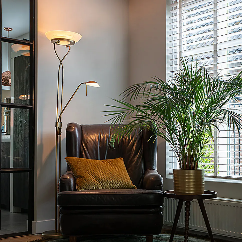 L’Empoli a tout pour plaire : un lampadaire moderne avec une liseuse. Son armature en acier est de couleur bronze, ce qui lui confère un aspect intemporel, tout comme le verre. Le lampadaire a un diamètre de 32 cm et une hauteur totale de 180 cm. Le bras réglable mesure 65 cm de long. La base de la lampe a un diamètre de 28 cm et une hauteur de 3,5 cm. L’Empoli est livré avec un cordon (250 cm) et une prise. Le lampadaire est doté de 2 points lumineux LED, chacun intégré à l’armature. L’Empoli a une puissance lumineuse de 3 000 Kelvin et 3 000 lumens, ce qui en fait un véritable concentré de puissance ! Heureusement, la lampe est dimmable, à la fois le lampadaire et la liseuse. Ils peuvent chacun être réglés séparément. En moyenne, le lampadaire dure 20 000 heures. L’Empoli est le lampadaire idéal pour le salon. Un design moderne qui est super pratique lorsque vous lisez un livre dans votre fauteuil. Que demander de plus ?