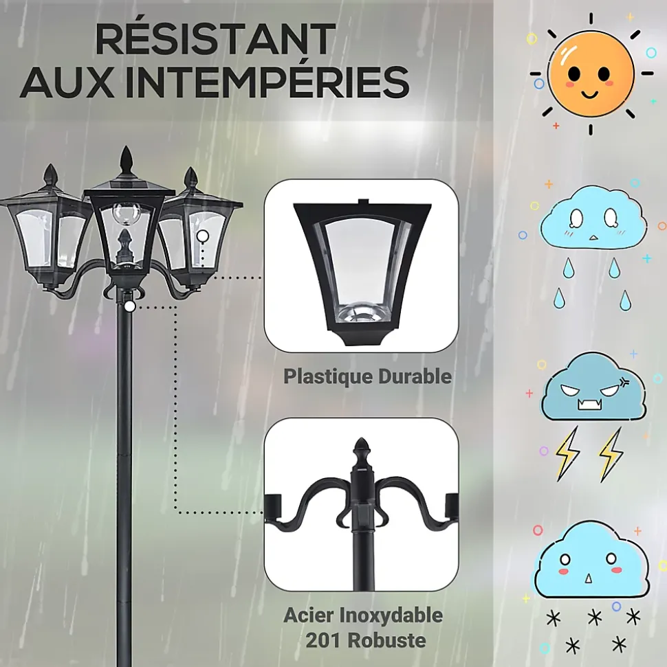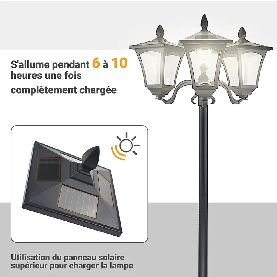 Ce superbe lampadaire LED noir 3 têtes à énergie solaire apportera une touche d’élégance et de romantisme à votre jardin. Doté d’un système interne de gestion de l’éclairage via détecteur de luminosité, il illuminera l’espace de votre choix : terrasse, bo