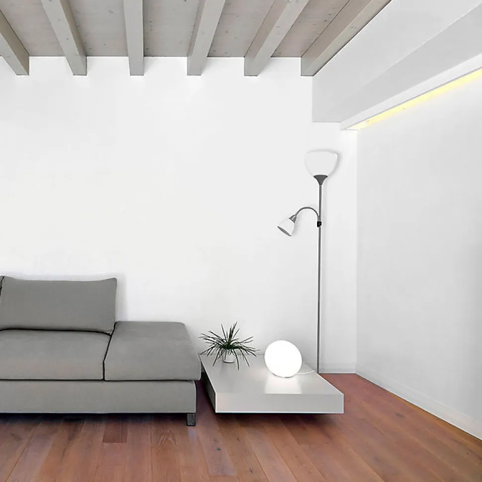 Lampadaire contemporain modèle Boston de la marque EDM. Il mesure 176 cm et nécessite 2 ampoules : E27 60W et E14 40W (non incluses). Sa structure en métal de couleur argent s’intègre parfaitement dans un salon moderne.