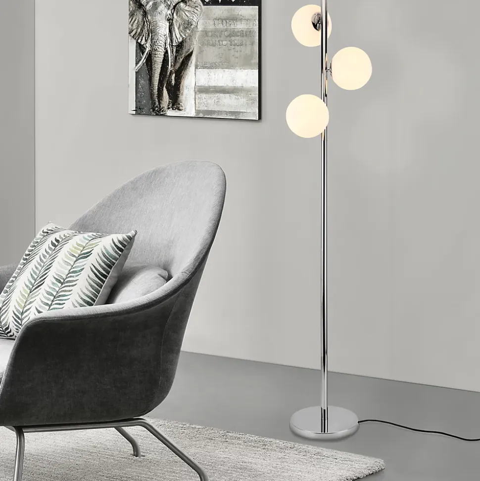 LampadaireCe lampadaire stylé avec trois boules attire le regard et surprend par sa modernité.Description :- design de haute qualité- éclairage efficace- modèle :Gent- alimentation : 230V, 50Hz- signeCE, conforme RoHs- type d’interrupteur : à cordon- douille :3 x E14, max. 40W (sans ampoules)Matière :armature en métal, boules en verreCouleur :armature : chrome, boules : blancDimensions :hauteur :154 cmdiamètre :25 cmlongueur de câble : env. 180 cmContenu de la livraison :1 x lampadaire (sans ampoules)Produit de la marque[lux.pro]