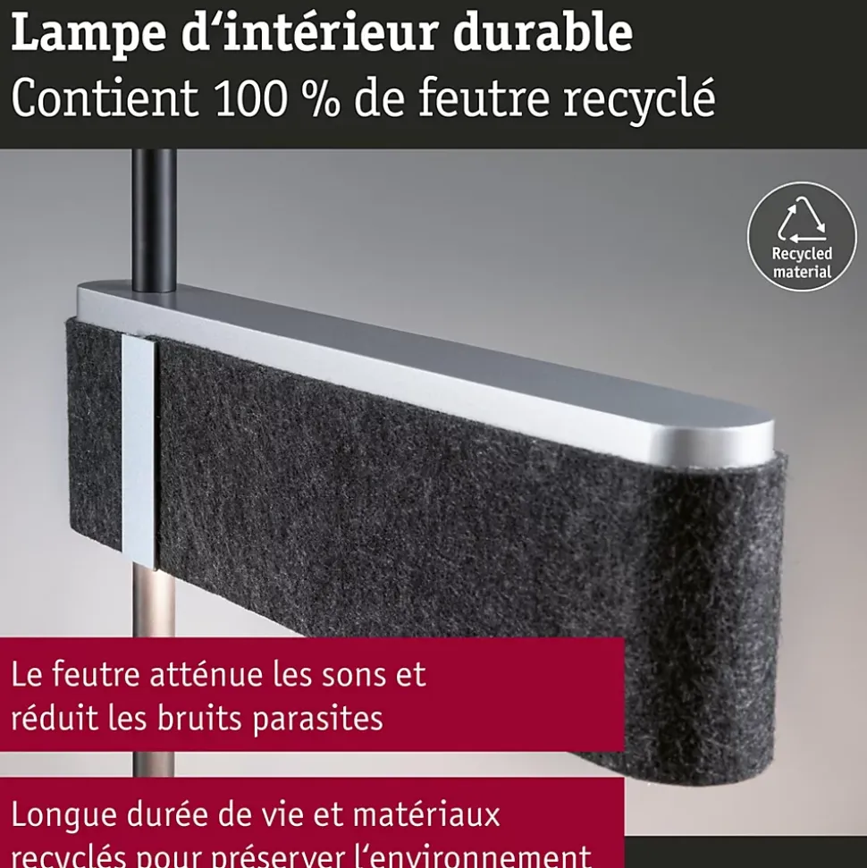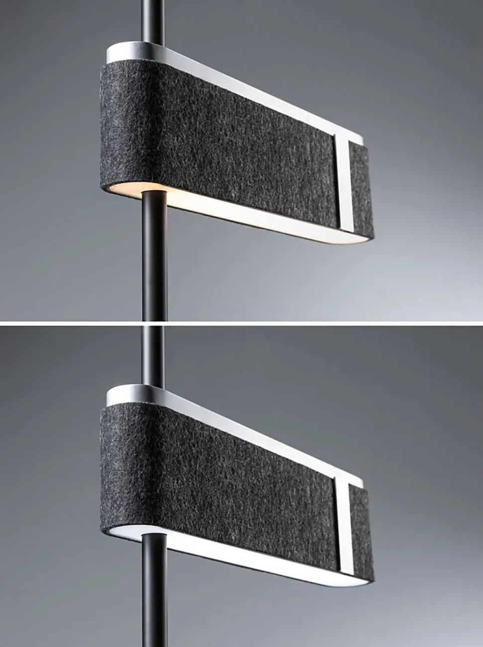 La fonction de mémoire enregistre le dernier niveau utilisé jusqu’à la prochaine mise en marche.|Température de couleur: 2700K – Blanc chaud|3 niveaux de luminosité|Les luminaires en feutre sont durables et atténuent les bruits|Design technique discret et minimaliste|Matériau recyclé durable (part recyclée minimale de 60 % dans le feutre)