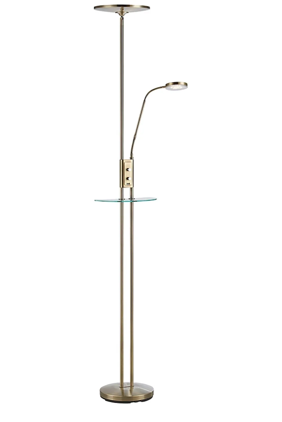 Les caractéristiques techniquesLe lampadaire Friend de Markslöjd est un luminaire fonctionnel et moderne, parfait pour répondre à tous les besoins d’éclairage et de confort.Il dispose d’un éclairage LED fixe de 18W orienté vers le haut, et d’une liseuse LED de 5W. Chaque source lumineuse est dimmable grâce à un variateur situé sur le poteau. Il comprend également une tablette en verre équipée d’un port USB pour recharger facilement vos appareils électroniques.Les avantages esthétiquesSa finition en laiton antique apporte une touche d’élégance classique. Le design épuré s’adapte aussi bien aux intérieurs modernes qu’aux ambiances plus traditionnelles.Le tout est souligné par un câble noir discret et une belle hauteur de 181 cm, idéale pour un éclairage efficace et confortable.Conseils décoPlacez-le à côté d’un canapé ou d’un fauteuil pour créer un coin lecture cosy et connecté. Ce lampadaire est aussi parfait dans un bureau ou un salon moderne qui allie style et praticité.