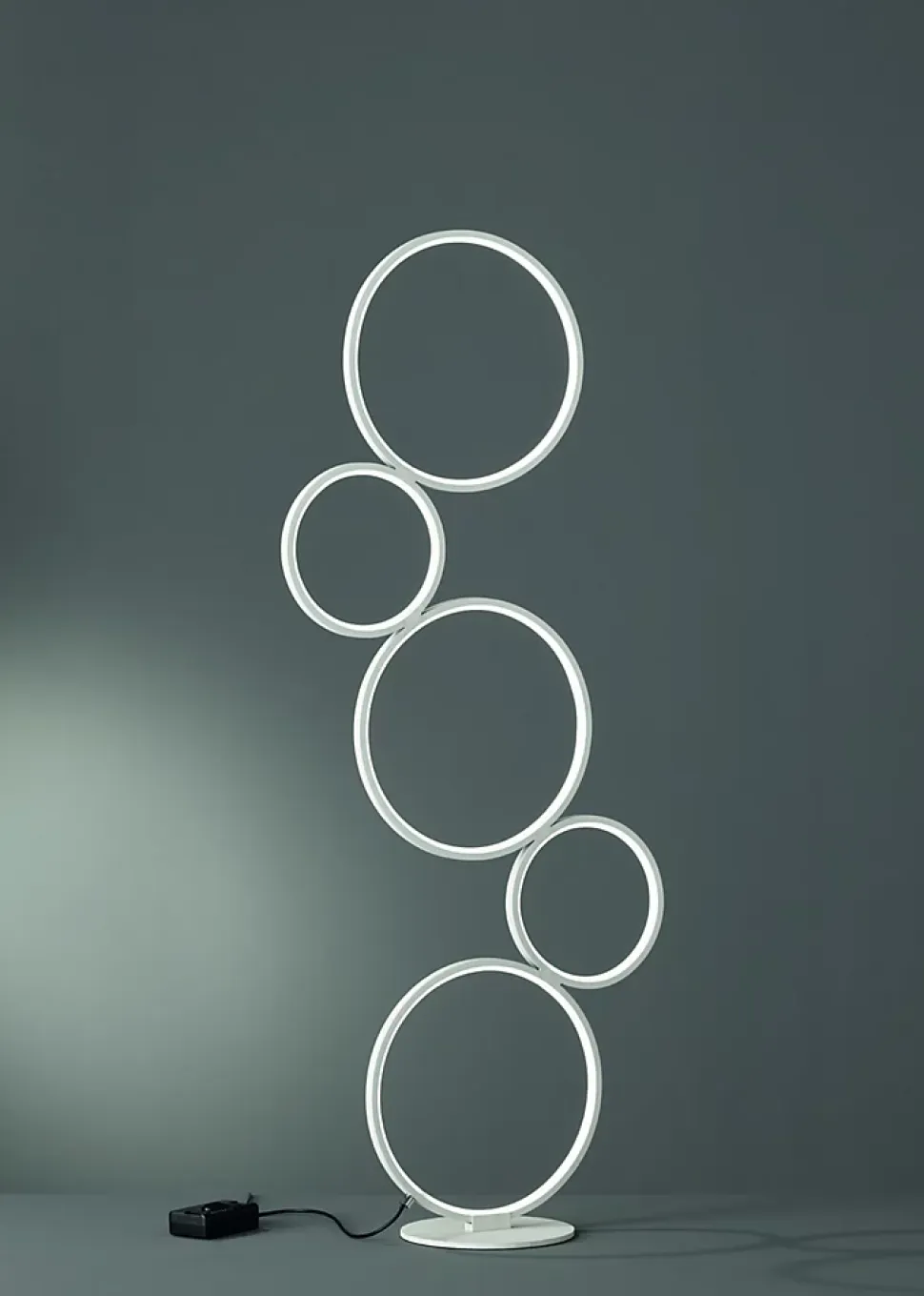 Les caractéristiques techniquesLe lampadaire ledTrio Rondo séduit avec ses cinq anneaux empilés aux diamètres variés, équipés d’une LED SMD intégrée de 36W qui délivre une luminosité puissante de 4700 lumens en blanc chaud (3000K).Il dispose d’un variateur d’intensité intégré, commandé via un interrupteur à pied, pour ajuster facilement la luminosité selon l’ambiance souhaitée.Les avantages esthétiquesLa finition blanc mat de ce lampadaire contemporain lui permet de s’intégrer harmonieusement à divers styles de décoration intérieure, ajoutant une touche design et élégante à votre pièce.Économie d’énergie et durabilitéLa technologie LED moderne garantit une consommation d’énergie réduite jusqu’à 80 % comparée aux lampes halogènes classiques. Elle offre également une longue durée de vie de 30 000 heures, une faible émission de chaleur et un impact environnemental limité.