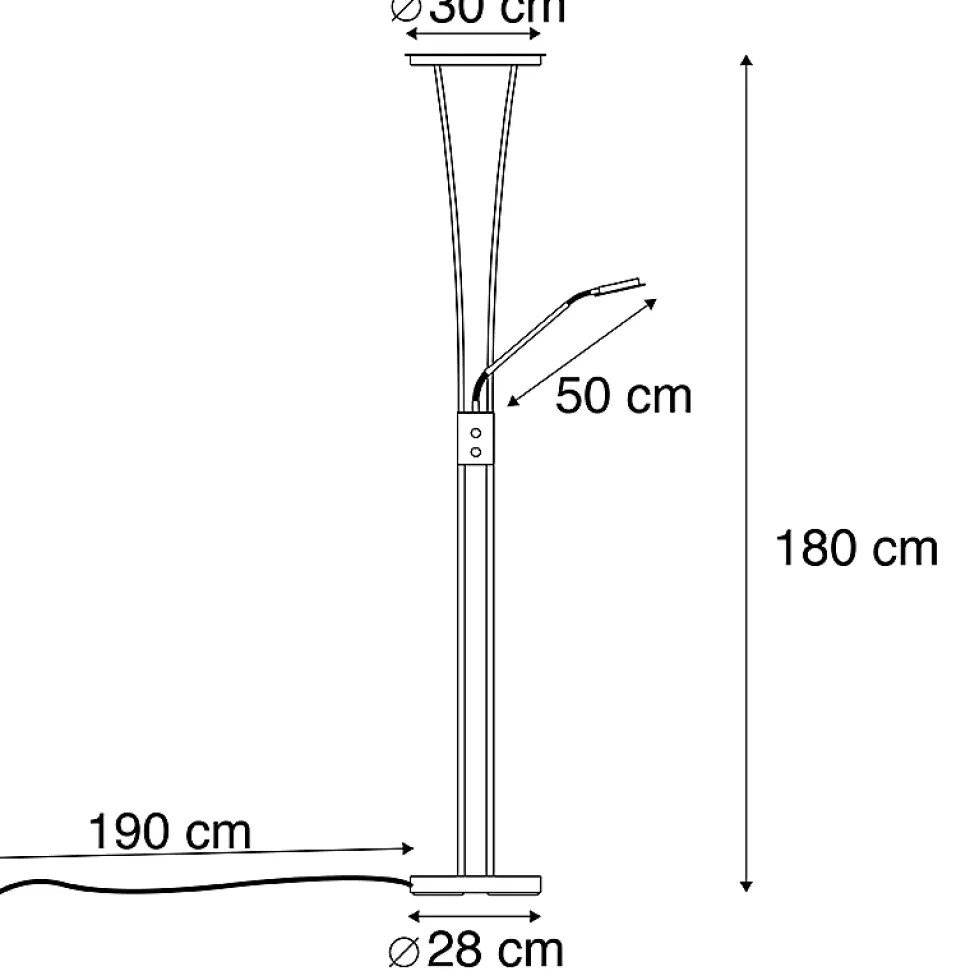 Ce lampadaire Divine noir intemporel est idéal pour créer une ambiance dans votre salon ou votre chambre à coucher. Un éclairage d’ambiance et un bras de lecture réglable pour une lumière fonctionnelle là où vous en avez besoin. Que demander de plus ?! Notre Divine a une hauteur totale de 180 cm. La base a un diamètre de 28 cm. Il est livré avec un câble de 190 cm de long. Les deux lampes peuvent être utilisées séparément. Le bras de lecture est très facile à régler, ce qui est très pratique pour lire un livre. Le lampadaire est doté d’un éclairage vers le haut (diamètre de 30 cm) comprenant une LED (intégrée à l’appareil). Ce module LED a une puissance lumineuse de 2 700 Kelvin et 1 800 lumens. Le bras de lecture a 400 lumens et 2 700 Kelvin. Ces points lumineux peuvent être atténués séparément. La lampe dure longtemps avec une moyenne de 20 000 heures de combustion. Un lampadaire super fonctionnel pour la lecture et, grâce à la fonction d’atténuation de la lampe, il devient un créateur d’ambiance dans votre intérieur.