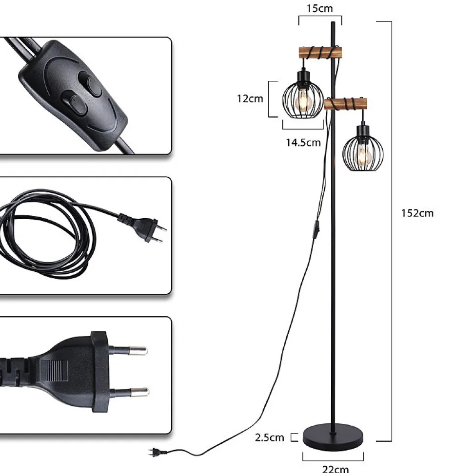 DESIGN : Ce lampadaire allie avec raffinement métal et bois flammé. Ses câbles noirs s’enroulent naturellement autour des poutres en bois et son abat-jour noir en forme de cage crée une atmosphère rétro-industrielle affirmée.DOUBLE INTERRUPTEUR : Ce lampadaire noir est équipé de deux interrupteurs indépendants permettant de contrôler chaque tête de lampe séparément, vous permettant ainsi de répondre facilement à vos différents besoins d’éclairage. Que vous souhaitiez créer une ambiance chaleureuse ou vous concentrer sur votre lecture, vous pouvez changer d’interrupteur en toute flexibilité pour une expérience plus personnalisée et confortable.CARACTÉRISTIQUES TECHNIQUES : Hauteur totale du lampadaire : 152 cm ; Diamètre de la base : 23 cm ; Hauteur de l’abat-jour : 14,7 cm ; Diamètre de l’abat-jour : 14,5 cm ; Longueur du câble : 310 cm ; Douille : E27 (max. 25 watts) ; Remarque : Ampoules non incluses.INSTALLATION FACILE : Ce lampadaire vintage est très facile à installer. Suivez simplement les instructions et serrez la tige section par section. Aucun outil supplémentaire n’est requis. L’assemblage peut être réalisé par une seule personne, ce qui permet de gagner du temps et de l’énergie.UTILISATIONS MULTIPLES : Ce lampadaire de style vintage est parfait pour le salon, la chambre, le bureau ou un coin, apportant chaleur et style à votre intérieur. Son design simple et généreux en fait un cadeau idéal pour la famille, les amis ou les collègues, à la fois pratique et élégant.