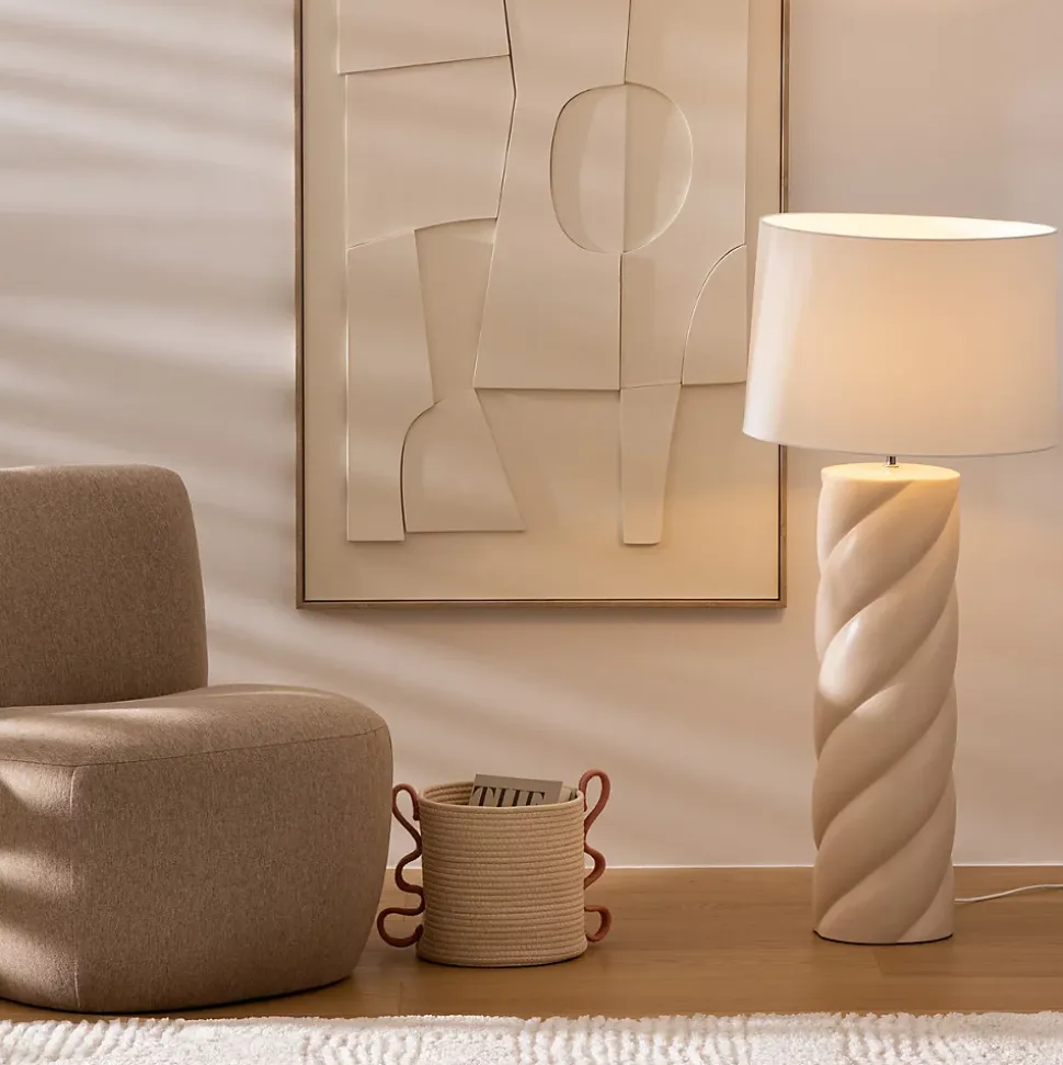 Le lampadaire « Noly » Atmosphera étonnera vos invités avec son pied torsadé en céramique. Sa lumière douce et apaisante procure du bien-être dans n’importe quelle pièce de votre maison. Ampoule compatible non fournie E27. Hauteur non réglable. Non orientableConseils d’entretienDépoussiérez régulièrement pour éliminer la saleté et la poussière à l’aide d’un chiffon doux.Déballage et montageLors de l’ouverture de votre colis, veillez à ne pas enfoncer une lame trop profondément pour éviter d’endommager le produit. Retirez les éléments de protection et d’emballage avec précaution, sans utiliser d’outils tranchants.Conservez l’emballage et la notice quelques jours en cas de retour ou de démontage.Consultez les consignes de tri de votre commune pour recycler correctement votre emballage. Nos photos sont prises en studio, il peut arriver que les couleurs soient influencées par cet éclairage spécifique, mais nous nous efforçons de réaliser des prises de vue aussi proches de la réalité que possible.