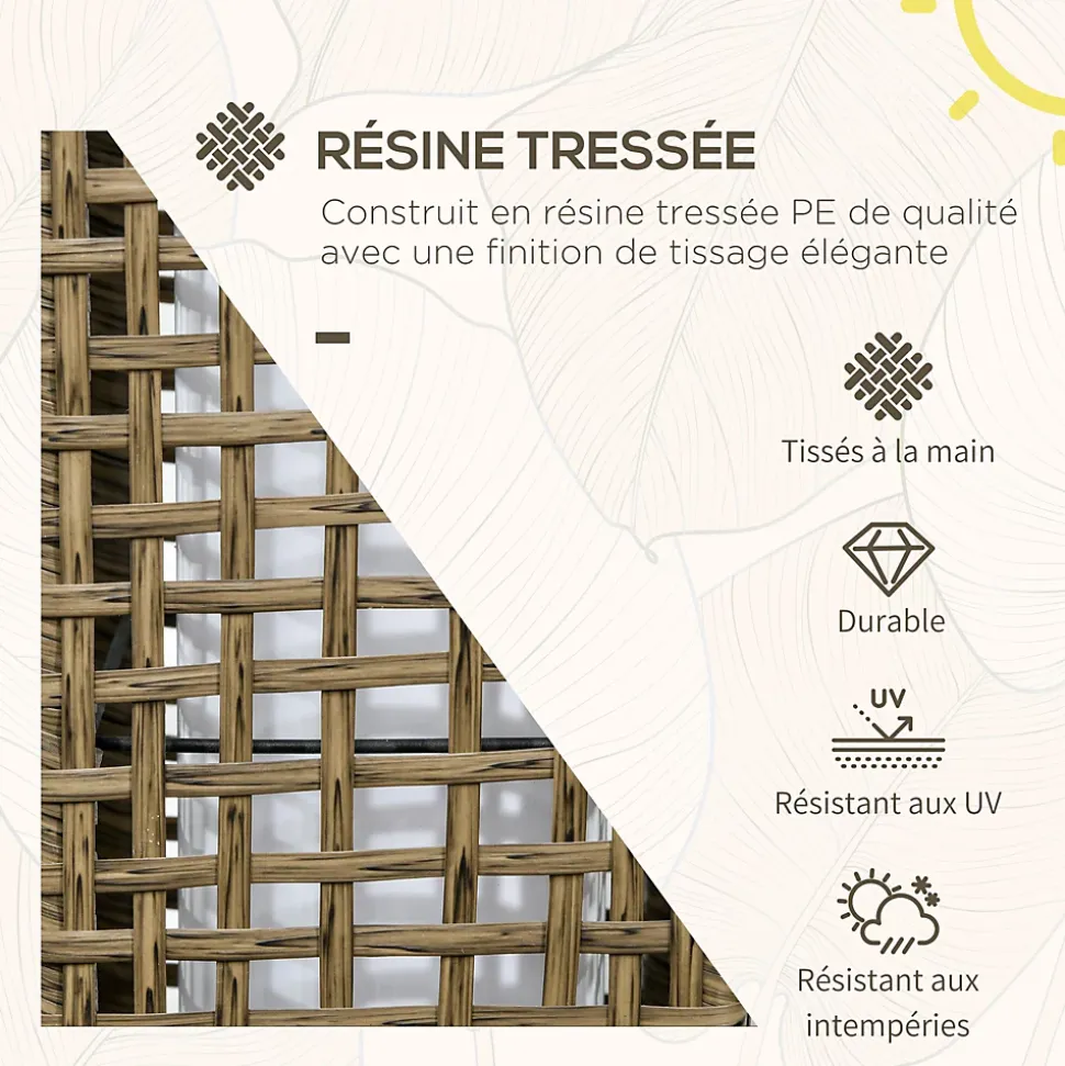 Créez une ambiance chaleureuse dans votre jardin avec le lampadaire solaire extérieur d’Outsunny. Design élégant en rotin synthétique, chargé par un panneau solaire pour 8 heures d’éclairage, il embellit tout espace extérieur.Caractéristiques :- Lampadaire extérieur sur pied décorative, fonctionne à l’énergie solaire- Le panneau solaire situé sur le dessus se charge pendant la journée pour pouvoir éclairer dès que le soleil se couche- Ajoutez une touche décorative à votre terrasse, jardin ou patio, surtout la nuit- Son style moderne et élégant apportera une touche sophistiquée où que vous la placiez- Lampadaire solaire fournit un éclairage jusqu’à 8 heures avec une charge complète- Structure métallique et revêtue en rotin PE, offre une grande résistance aux intempéries et à la corrosion- Design compact et portable pour économiser de l’espace et se déplacer facilement- En fonctionnant à l’énergie solaire, vous économiserez sur votre facture d’électricité, car elle n’a pas besoin d’être branchée au réseau électrique.Spécifications :- Couleurs : cadre noir, rotin PE sable- Matériaux : acier et résine tressée imitation rotin- Dim. totales : 15,5L x 15,5l x 69H cm- Dim. de la zone inférieure : 15L x 15l cm- Dim. du panneau solaire : 12L x 12l cm- Nombre de LED : 25- Puissance de la lumière LED : 0,06 W (unité simple)- Température de couleur : 2500K- Flux lumineux total : 15 lm- Batterie rechargeable : AA Ni-mh 1,2V 1200mAh- Temps de charge : 5 heures avec suffisamment de lumière solaire- Temps d’éclairage : 8 heures (complètement chargé)- Lumière : lumière chaude (blanche)- Réf. : 867-130V01SD