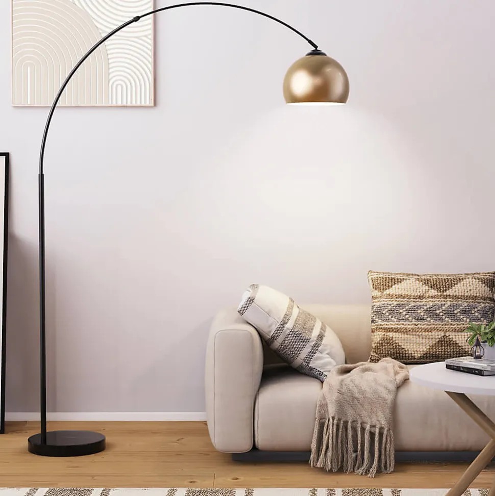 Dimensions (L x P x H) : 145 x 35 x 200 cmLampe à arc avec abat-jour en métal doréPied stable en aluminium noirCâble noir avec interrupteur à pédaleCombinaison d’élégance intemporelle et de design moderneParfait pour le salon, la chambre à coucher ou comme éclairage de styleLampe à arc TALIA – l’élégance rencontre le raffinement moderneLa lampe à arc TALIA allie une élégance intemporelle à un design moderne. L’abat-jour en métal doré diffuse une lumière chaude et agréable et apporte une touche de style à ton intérieur. Le pied en marbre noir confère à la lampe une noble sobriété tout en assurant la stabilité et une bonne assise. Le câble noir avec un interrupteur pratique te permet de commander la lampe très confortablement avec le pied.Que ce soit dans le salon, à côté du canapé ou comme éclairage d’ambiance dans la chambre à coucher, la TALIA attire tous les regards et fait briller chaque intérieur. Détails du produit:Lampe à arc avec abat-jour en métal doré pour une lumière éléganteLe pied stable en marbre noir assure une bonne stabilité et un raffinement moderneCâble noir avec interrupteur à pédale pour une utilisation simple et confortableParfait pour le salon, la chambre à coucher ou comme éclairage élégant à côté du canapéCombinaison d’élégance intemporelle et de design moderneInteraction harmonieuse entre le métal doré et l’aluminium noirIdéal pour les concepts d’aménagement minimalistes et modernesDiffuse une atmosphère chaleureuse et agréable et crée des accents raffinés dans la pièce