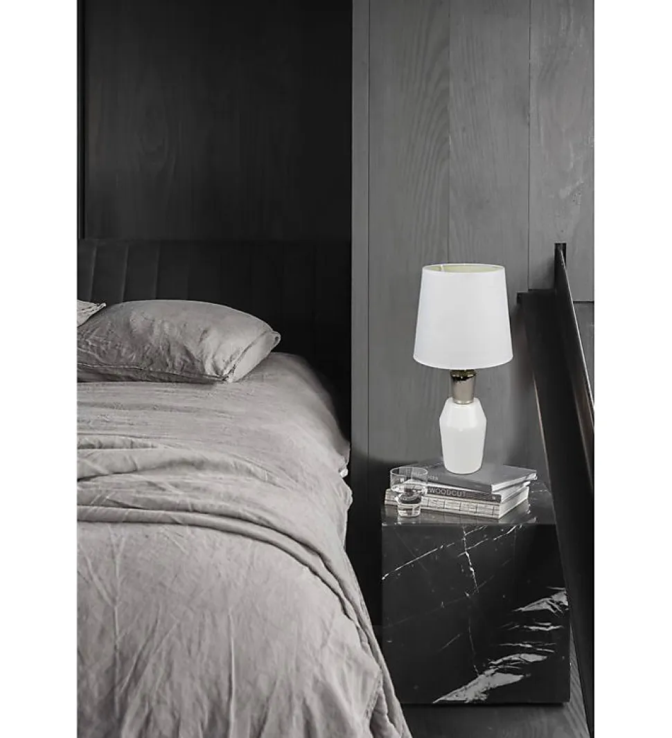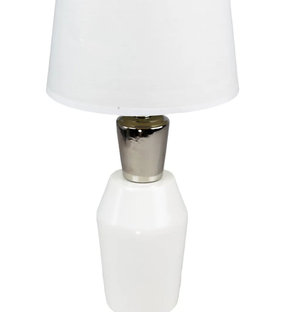Petite lampe à poser pied céramique blanc et argent et abat-jour tissuCompatible ampoules LED (Ampoule basse consommation fournie)Descriptif :Couleur : noir et argentMatériau : Pied en céramique, Abat-jour en tissuUsages spécifiques : Usage intérieur uniquementDiamètre abat-jour : 20 cmHauteur Abat-jour : 18 cmHauteur totale (socle et abat-jour) : 44 cmCaractéristiques techniques :Type d’ampoule compatible : LED, Halogène, Fluo compacteType de culot : E14Puissance : 40 WattsAmpoule incluse : OuiVolt : 230Branchement : prise secteurType d’interrupteur : Bouton basculeOptez pour cette petite lampe à poser en céramique dont le design sobre mais élégant s’adaptera à tous les styles d’intérieur.D’une hauteur total de 44 cm, cette lampe à poser conviendra à la décoration de votre salon ou de votre chambre comme lampe de chevet.L’utilisation d’un luminaire adapté aux ampoules LED vous permettra de réaliser des économies d’énergie