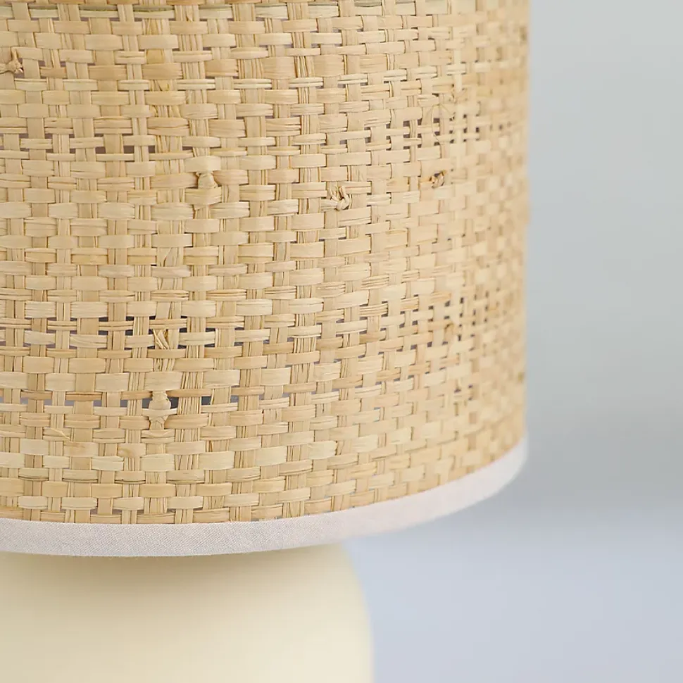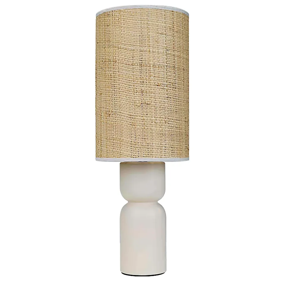 - Sculpturale et chaleureuse, la petite lampe RAJA allie céramique crème et abat-jour en raphia tressé pour une lumière douce et une touche artisanale contemporaine.