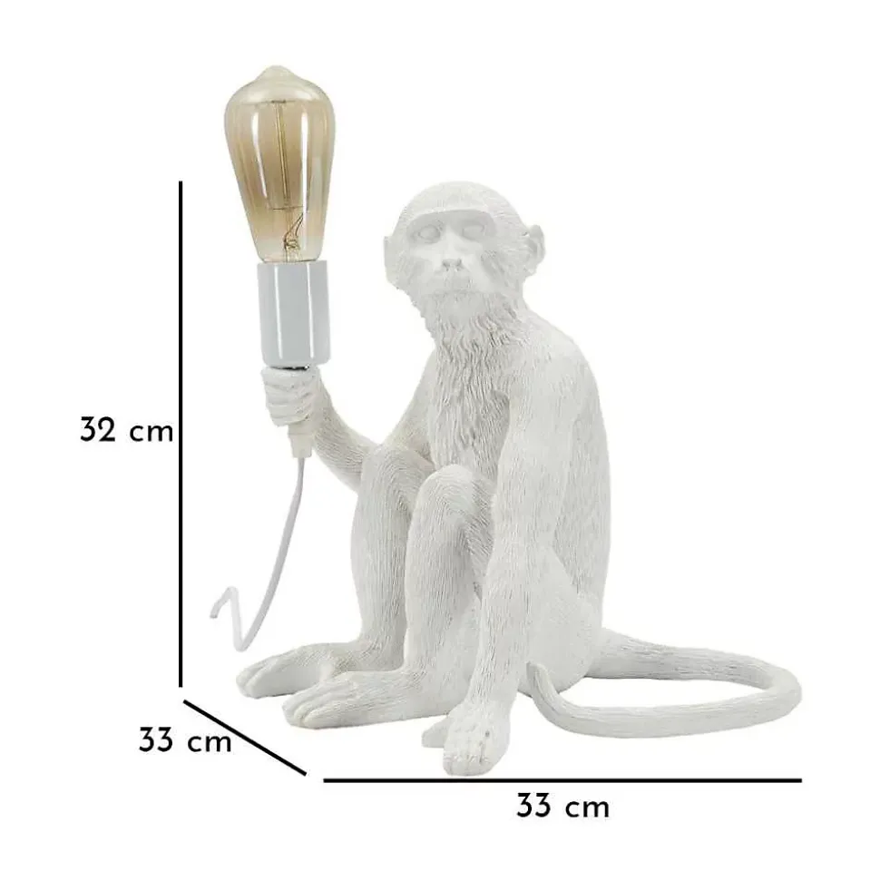 Aspect : Matériau principal = Polyrésine • Dimensions : Hauteur (en cm) = 32 • Longueur (en cm) = 33 • Profondeur (en cm) = 33 • Autres caractéristiques : Informations complémentaires = Ampoule compatible E27 non fournie • Poids (en kg) = 2,50 • Lampe à poser en polyrésine Monkey 33 x 33 x 32 cm