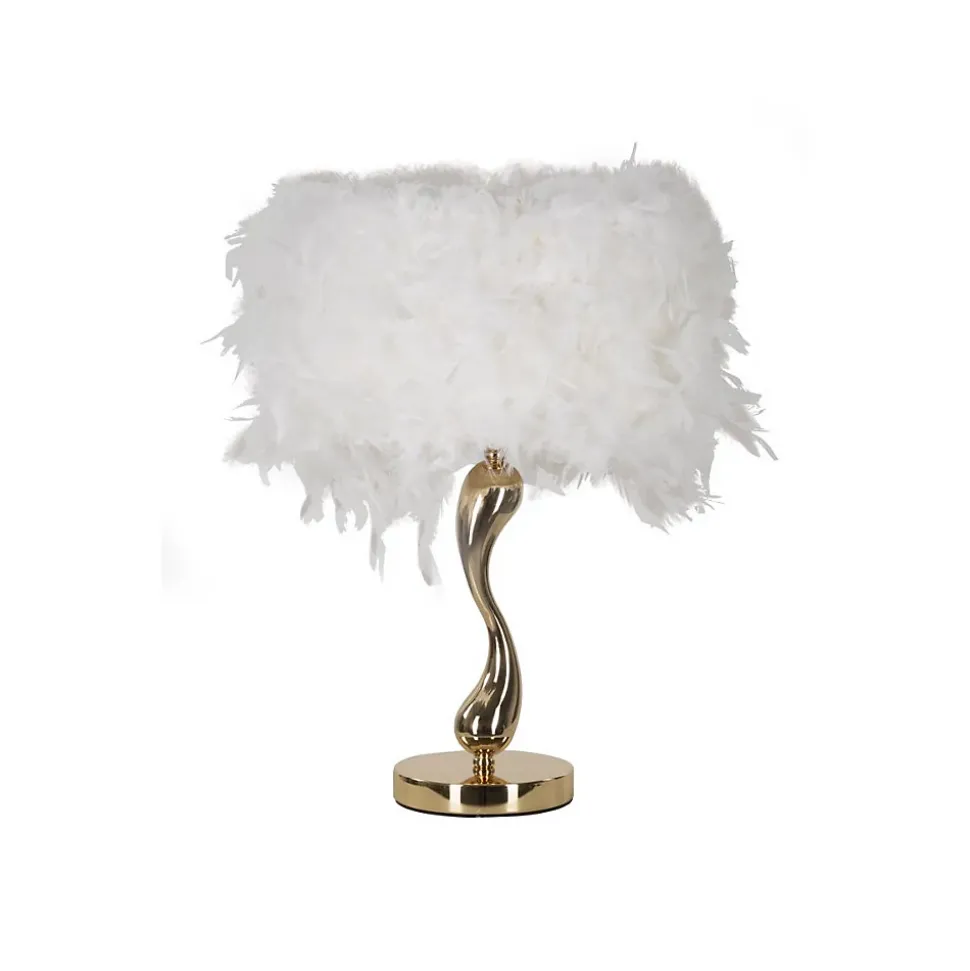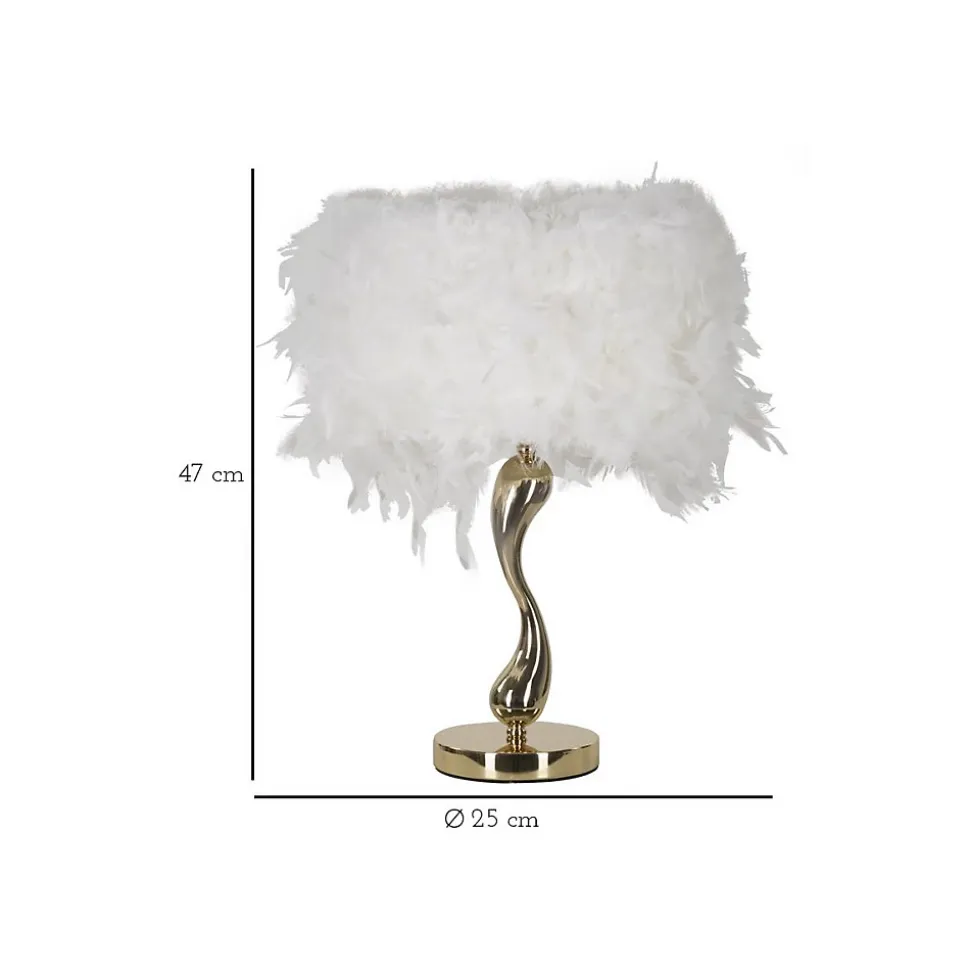 Informations Techniques :Dimensions : L. 25 x l. 25 x H. 47 cmMatières : Métal, Plastique & SynthétiqueSpécificités :Originale & UtileLampe de table designAbat-jour imitation plumeAmpoule non incluseDouille : E27Puissance : 40 WVoltage : 220 VFréquence : 50 HzPoids : 1 kgCouleur : Or & Blanc