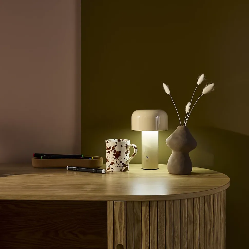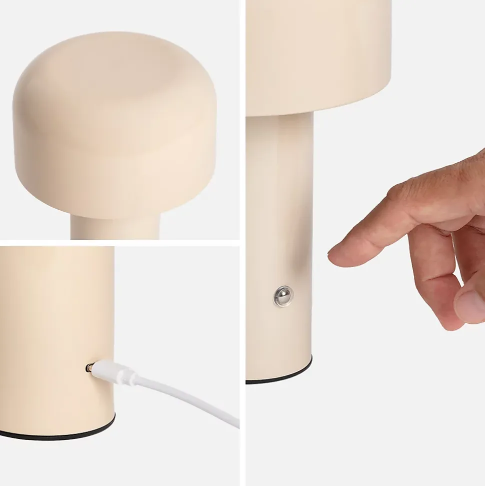 Les + produit :En forme de champignonEclairage douxPeut être utilisée sans être branchéeRechargeableLa lampe de table LED Victor ne manquera pas d’attirer les regards ! Avec sa forme de champignon, son design contemporain et ludique apportera une touche de fantaisie dans votre intérieur. Cette lampe est parfaite pour créer une ambiance cosy et apaisante. A l’aide du bouton, choisissez la lumière qui vous convient entre le blanc chaud, neutre ou froid. Minimaliste mais unique, c’est un véritable objet décoratif à la fois pratique et stylé. Information complémentaire :Un câble USB est fourni pour la recharge.Dimensions et caractéristiques :Matière : MétalDimensions : Ø 13 x 21 cmBase : Ø 6 cmPoids : 0,5 kgCouleur lumière : Blanc chaud, blanc neutre, blanc froidPuissance : 2 W (180 lm)Protection : IP 20Batterie rechargeable, câble USB fourniBatterie (1800mAh)Temps de charge : 2 h