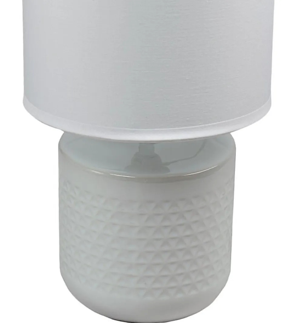 Lampe à poser, pied en céramique motifs losanges et abat-jour tissu blancCompatible ampoules LED (Ampoule basse consommation fournie)Descriptif :Couleur : BlancMatériau : Pied en céramique, Abat-jour en tissuUsages spécifiques : Usage intérieur uniquementDiamètre abat-jour : 18 cmHauteur Abat-jour : 16 cmHauteur totale (socle et abat-jour) : 32 cmCaractéristiques techniques :Type d’ampoule compatible : LED, Halogène, Fluo compacteType de culot : E14Puissance : 40 WattsAmpoule incluse : OuiVolt : 230Branchement : prise secteurType d’interrupteur : Bouton basculeOptez pour cette lampe à poser en céramique dont le design en losange rappelle la forme des ananas.D’une hauteur total de 32 cm, cette lampe à poser conviendra à la décoration de votre salon ou de votre chambre comme lampe de chevet.L’utilisation d’un luminaire adapté aux ampoules LED vous permettra de réaliser des économies d’énergie