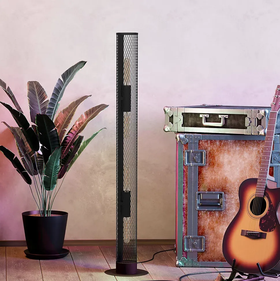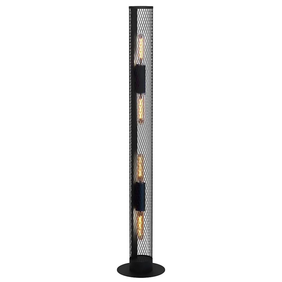 - Le lampadaire REDCLIFF se compose d’un long cylindre grillagé noir.