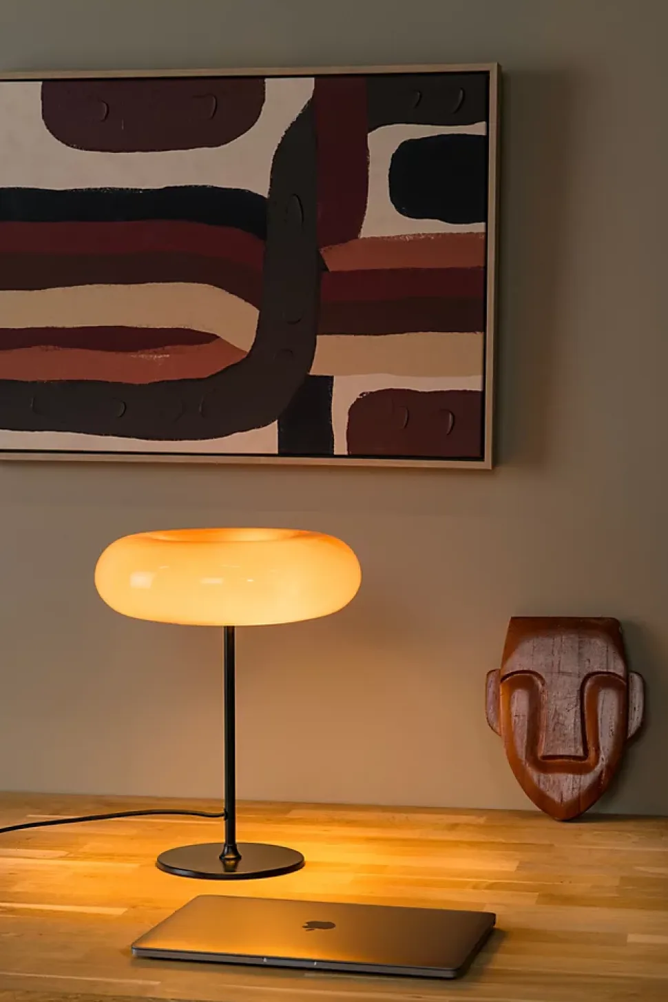 Vous aimez apporter une touche années 60 à votre décoration? Les formes arrondies et audacieuses de Sentino sont faites pour vous. Cette lampe à poser se distingue par son donut en verre laqué brillant, posé sur un socle et un pied métallique élancé. Sentino diffuse une lumière douce qui donne du caractère à la pièce. Même éteinte, elle reste un élément central dans votre bureau, chambre ou salon. Prêt à affirmer ce choix de design audacieux ?