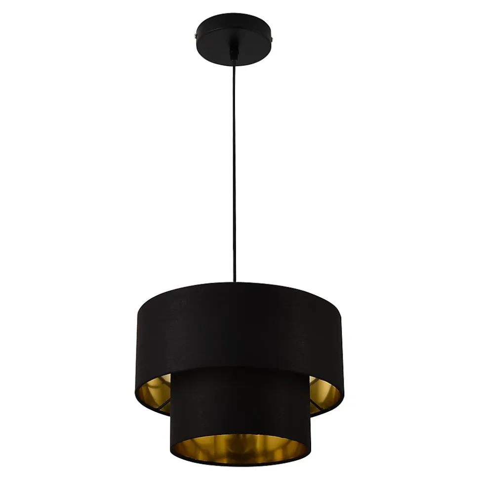 Suspension design Gâce à son apparance stylée, cette lampe à suspendre élégante et moderne embellira votre maison. Description : – suspension moderne et stylée pour l’intérieur – forme design – éclairage efficace Alimentation : 230V, 50Hz Type d’interrupteur : mural Douille : E27, max. 60W (le paquet à livrer ne contient pas d’ampoule)Matière : élément de fixation : métal l’abat-jour : textileCouleur : noir à l’extérieur, doré à l’intérieurDimensions : hauteur : ca. 149 cm avec le câble longueur du câble : ca. 125 cmdiamètre de l’abat-jour : ca. 30 cmdiamètre de l’élément de fixation au plafond : ca. 12 cm Contenu de la livraison : 1 x lampe à suspendre [sans ampoule] Produit de la marque [lux.pro].
