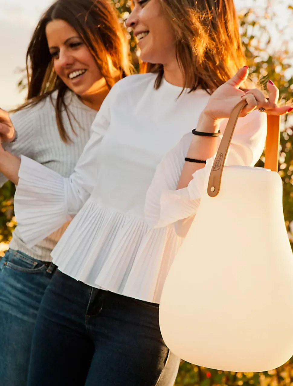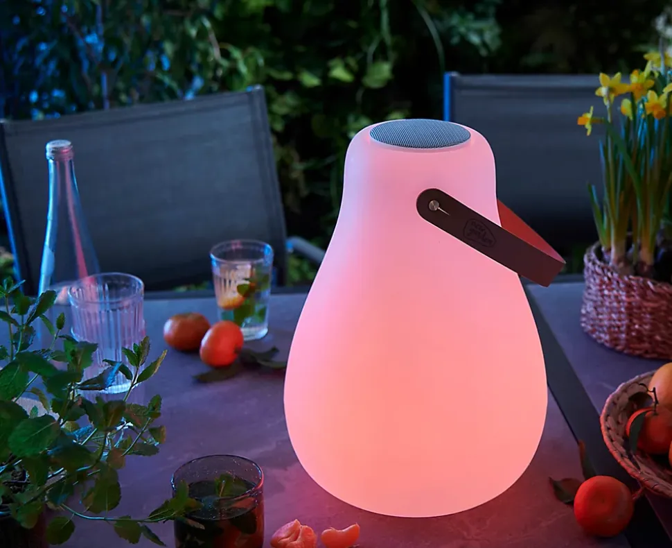 Lampe extérieure baladeuse, LED intégrée, 45lm IP43 1W, lumière variable RGB – New Garden. Cette lampe en forme de poire peut être transportée ou posée. Sa lumière variable apportera une ambiance exceptionnelle. Sa fonctionnalité musique vous permettra d’emmener vos morceaux préférés partout, 12h d’écoute. Facile à recharger grâce à sa batterie rechargeable via USBC. Elle dispose aussi d’une télécommande pour plus de praticité.