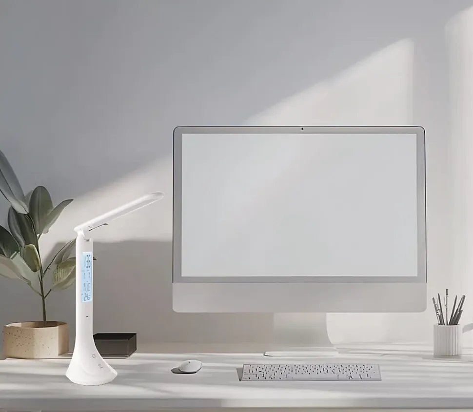 Apportez style et praticité à votre espace avec la lampe de table COLUCCIA blanche. Son design épuré et moderne s’intègre parfaitement à tout type d’intérieur, que ce soit sur un bureau, une table de chevet ou dans un coin télétravail. Dotée d’un bras flexible ajustable et d’un panneau de commande tactile, elle offre plusieurs niveaux de luminosité réglable pour s’adapter à tous vos besoins : lecture, travail ou lumière d’ambiance. Cette lampe LED sans éblouissement assure un éclairage confortable, même lors d’utilisations prolongées. Pratique, elle intègre un écran digital affichant l’heure, la date et la température ambiante. Compacte, fonctionnelle et esthétique, la lampe LED COLUCCIA est le choix idéal pour un éclairage de bureau moderne.