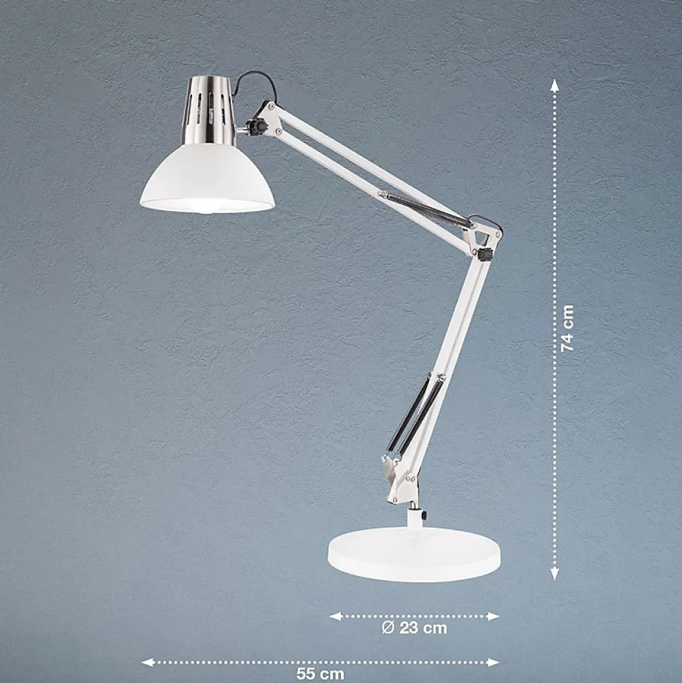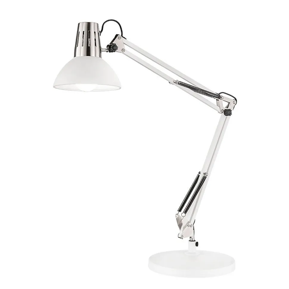 Les caractéristiques techniquesCette lampe de bureau est en métal blanc mat et chromé .Elle offre deux possibilités d’installation : lampe à poser sur son socle ou lampe à fixer sur le rebord d’un bureau ou d’une table grâce à son système de pince à visser.Elle fonctionne avec une ampoule E27, non fournie ce qui vous permet de choisir température de couleur et intensité lumineuse en fonction de vos goûts et besoins.Les avantages esthétiquesVous serez séduit par l’esthétique classique de la Lampe de bureau Pit de chez Fischer & Honsel.Avec son esthétique type lampe d’architecte et son support articulé sur 3 axes, elle s’harmonisera avec une décoration contemporaine épurée.Pit existe en noir, blanc ou gris.
