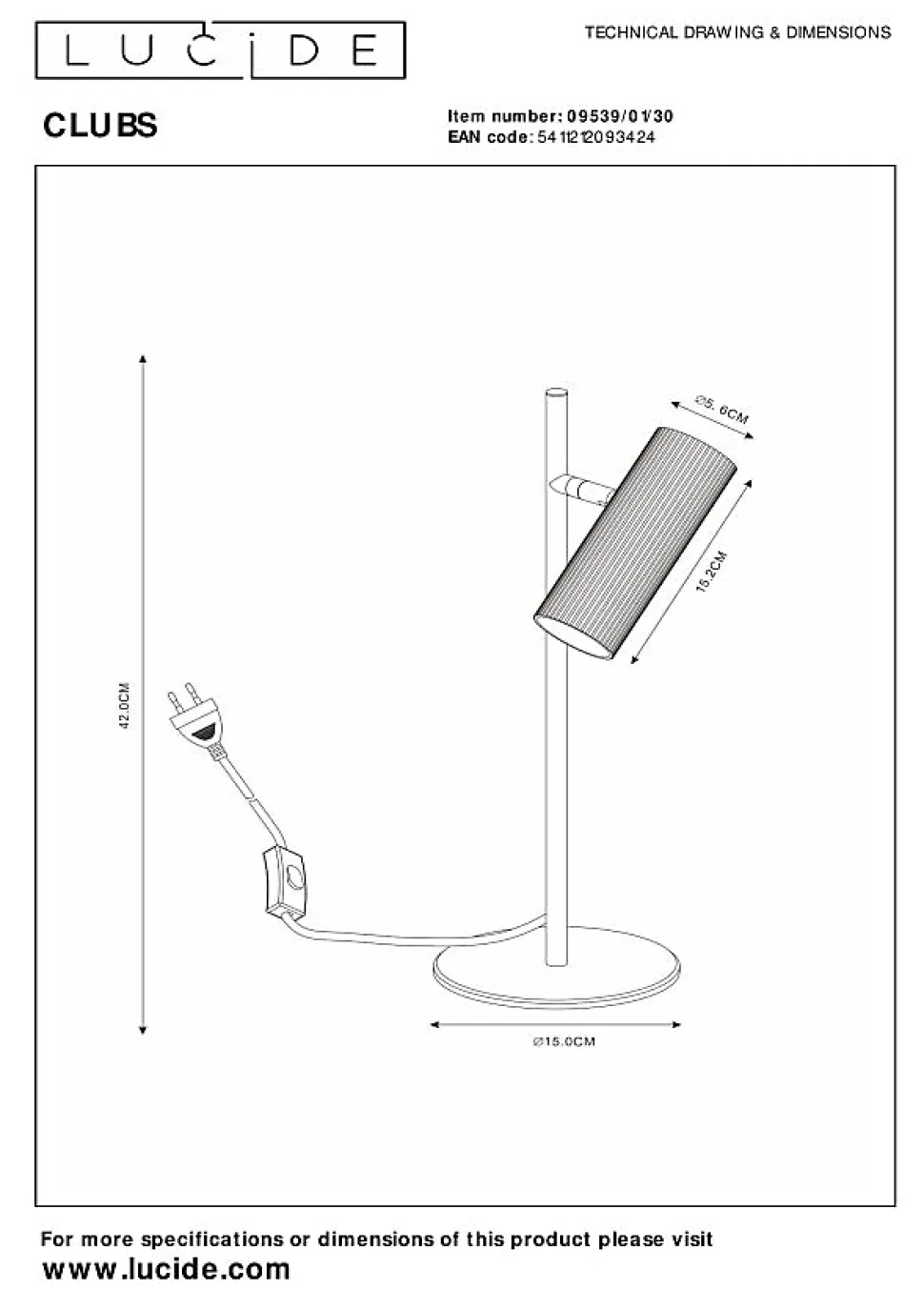 Clubs est une lampe de table élégante qui apporte de la lumière là où vous le souhaitez. Grâce à sa source lumineuse orientable et inclinable, elle s’adapte parfaitement à votre bureau, à votre table d’appoint ou à toute autre surface qui mérite d’être mise en valeur. Ce luminaire élégant est fabriqué en aluminium de haute qualité, avec un abat-jour étroit et cylindrique au relief dentelé. Il apporte une touche rétro dans un design moderne. Clubs peut accueillir une source lumineuse LED et est facile à contrôler grâce à l’interrupteur marche/arrêt situé sur le cordon. Faites-lui une place dans votre intérieur.Caractéristiques uniques:• Utilisable avec une source lumineuse LED• Cette lampe est rotative et inclinable• Avec un interrupteur On/off sur le câble• Fabriqué en aluminiumPrincipales caractéristiques du produit:• Consommation énergétique: 1x40W / 230V / Sans intensité variable (Ampoule non incluse)• Dimensions: Lon.15 x Larg.15 x Haut.42 cm• 2 Ans garantie sur le luminaire / source de lumière appropriée est EAN: 5411212490643Pourquoi choisir l’éclairage Lucide?Lucide incarne un design innovant, un savoir-faire artisanal et une fiabilité exemplaire. En tant qu’entreprise familiale belge avec plus de trois décennies d’expertise, nous concevons des éclairages de haute qualité qui enrichissent et transforment chaque espace, tant intérieur qu’extérieur. Notre collection polyvalente comprend des luminaires durables et des sources lumineuses économes en énergie, soigneusement conçus par nos propres experts et fabriqués selon les normes CE les plus strictes. Grâce à notre large gamme, nous vous proposons toujours une solution d’éclairage adaptée, quel que soit le style ou l’espace. Ainsi, nous illuminons non seulement votre espace de vie mais aussi votre processus de choix dans la recherche d’un éclairage de qualité et abordable. Chez Lucide, nous combinons innovation et savoir-faire po…