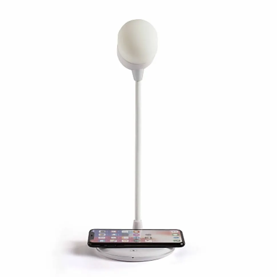 Ping vous propose :Une lampe ultra déco et multifonction.Avec ses 14 LEDs intégrées, vous aurez une lumière intense pour une consommation électrique très faible. Il vous sera non seulement possible de régler l’intensité lumineuse grâce au variateur intégré, mais également de choisir entre lumière blanche du jour pour un effet naturel, blanc neutre pour la consommation ou blanc chaud pour une ambiance agréable.La tête de la lampe, maintenue par un pied en silicone, est réellement orientable à 360° horizontalement et 180° verticalement.Mais profitez également d’une seconde fonction particulièrement pratique, un chargeur à induction pour votre mobile personnel.Cette lampe est compatible avec tous les mobiles (ANDROID et APPLE) et appareils certifiés QI.Précision = Les Iphone 12 et supérieurs ne fonctionnent pas sur ce dispositif.Enfin, une autre fonction cachée = haut-parleur sans fil via le système Bluetooth !Un vrai trésor lumineux de technologie ! Les plus du produit :- Lampe avec stat